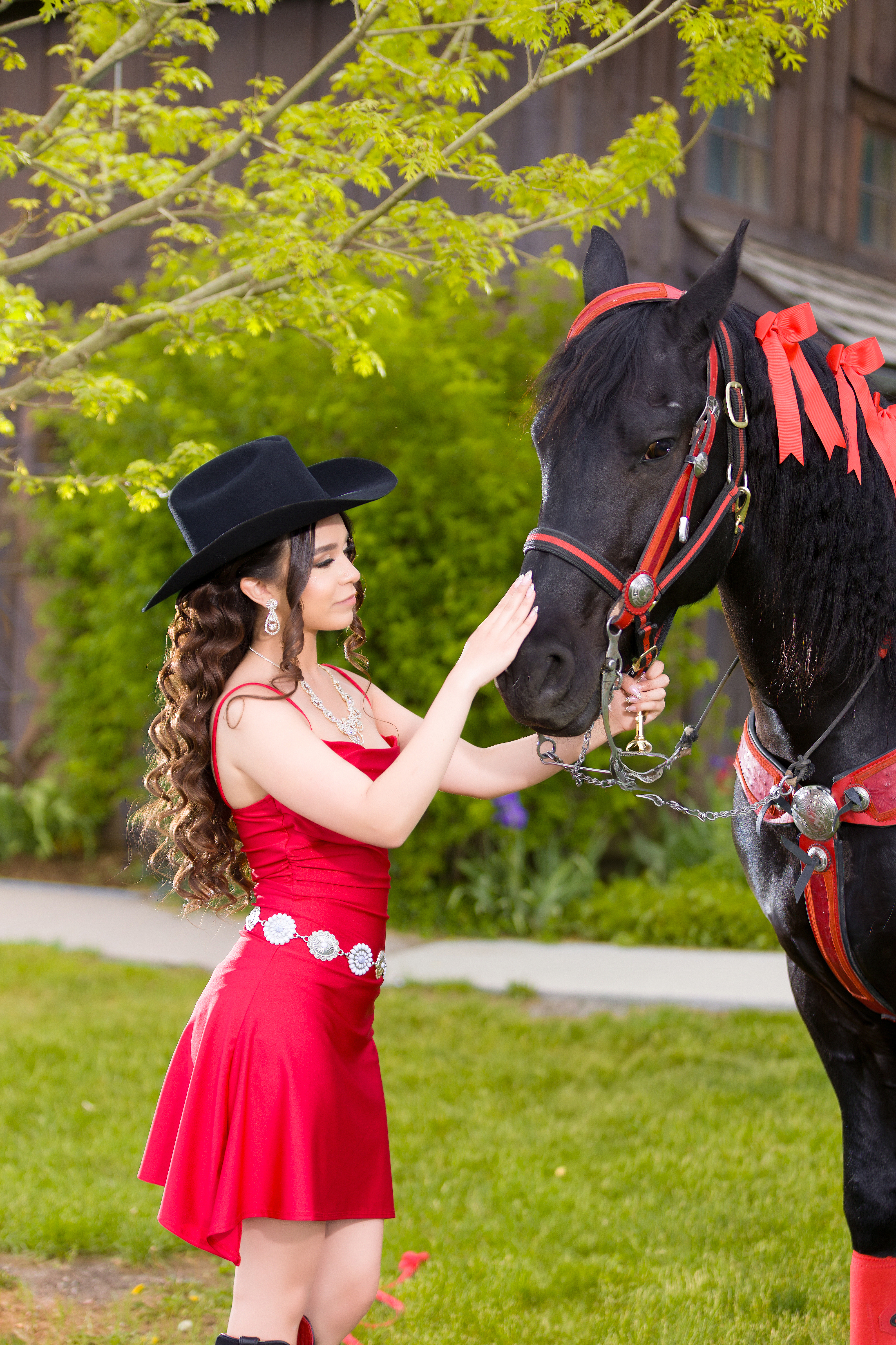 - Quinceañera in a red dress and black cowboy hat posing with a black horse at Belmar Park in Lakewood, Colorado