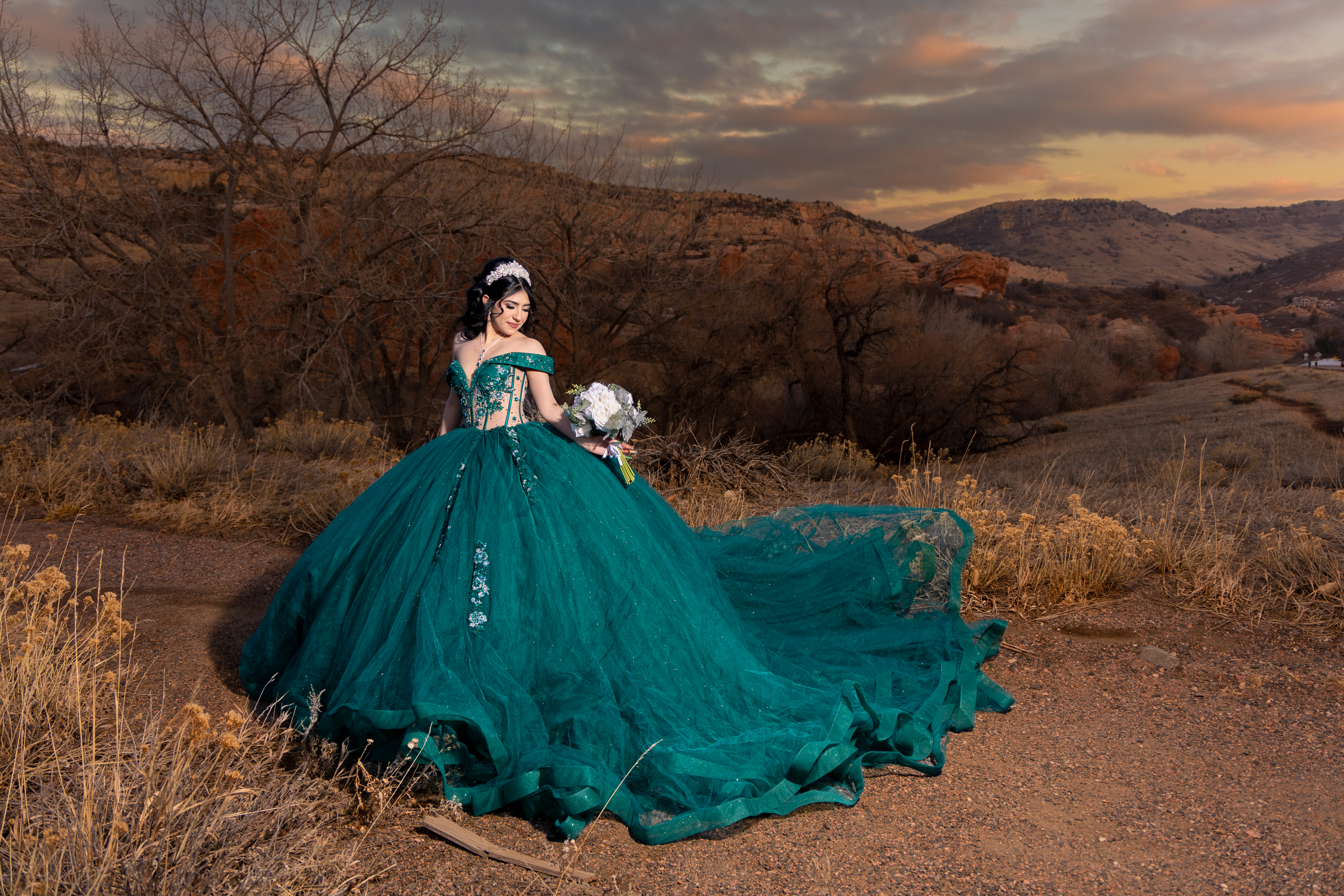- Quinceañera in emerald green dress posing in Colorado mountains at sunset