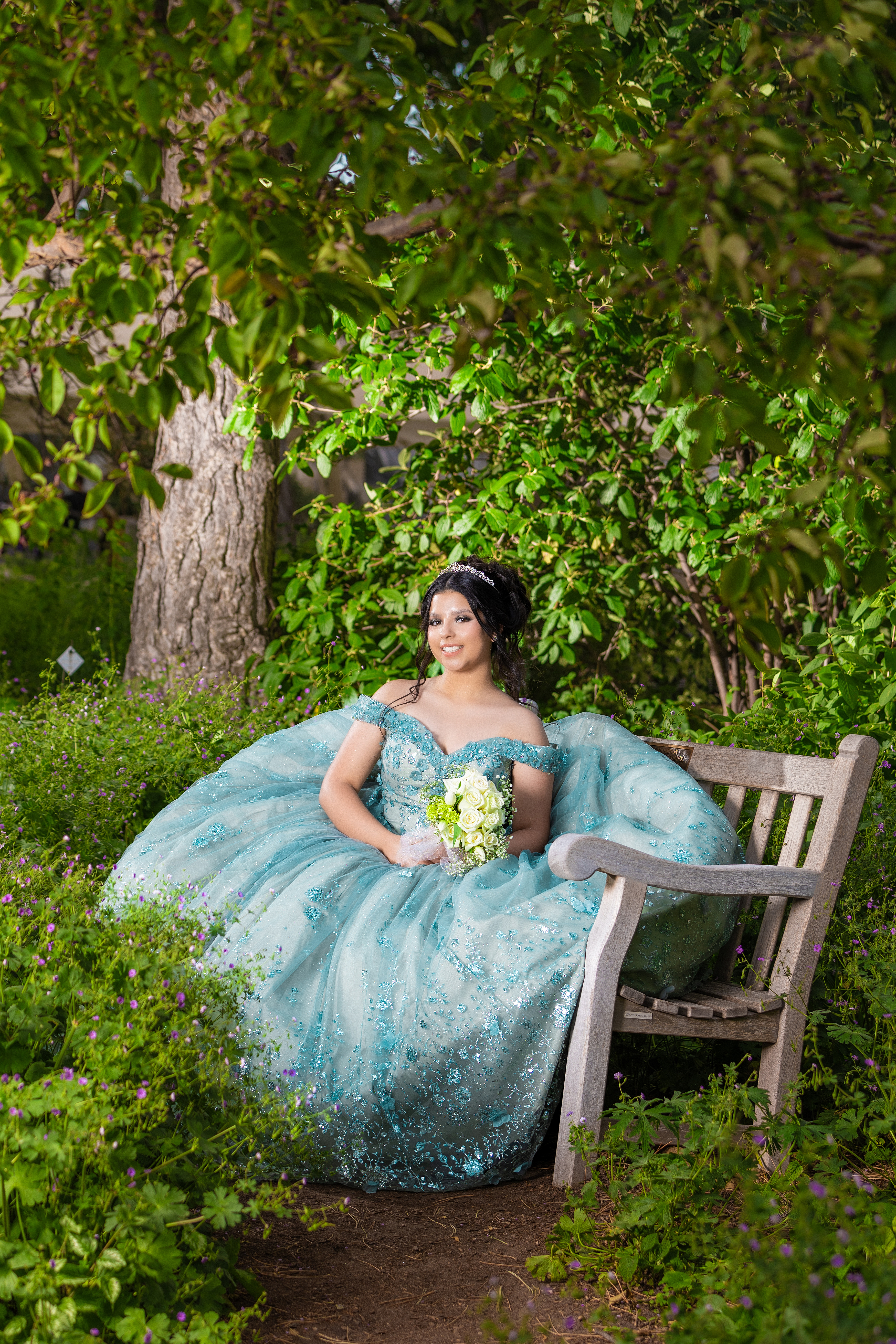 - Quinceañera photoshoot at Denver Botanic Gardens featuring a teal ball gown and bouquet seated on a garden bench surrounded by lush greenery.