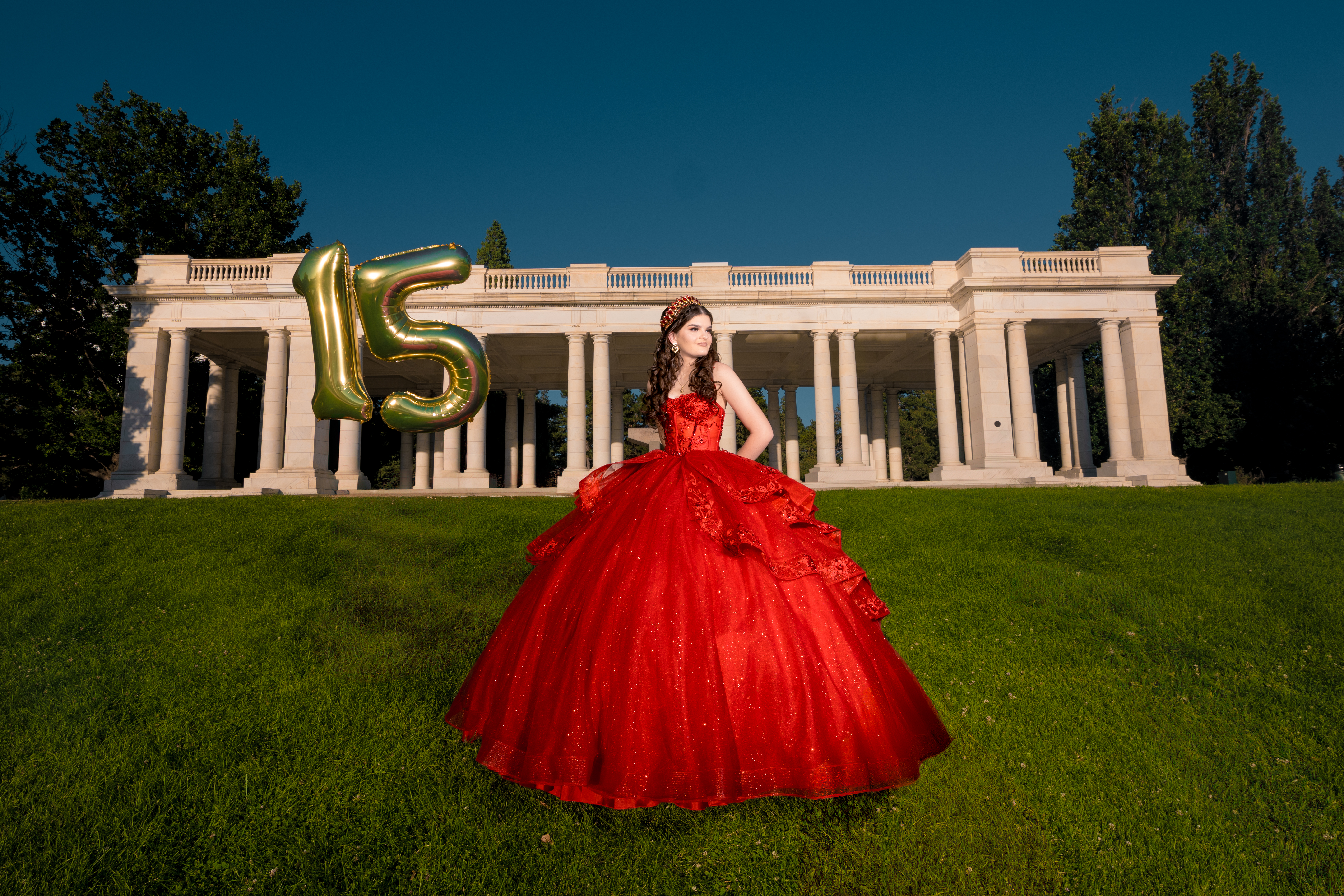 - Red quinceañera dress photoshoot at Cheesman Park Pavilion in Denver Colorado with 15 balloons captured by Denver quinceañera photographer.