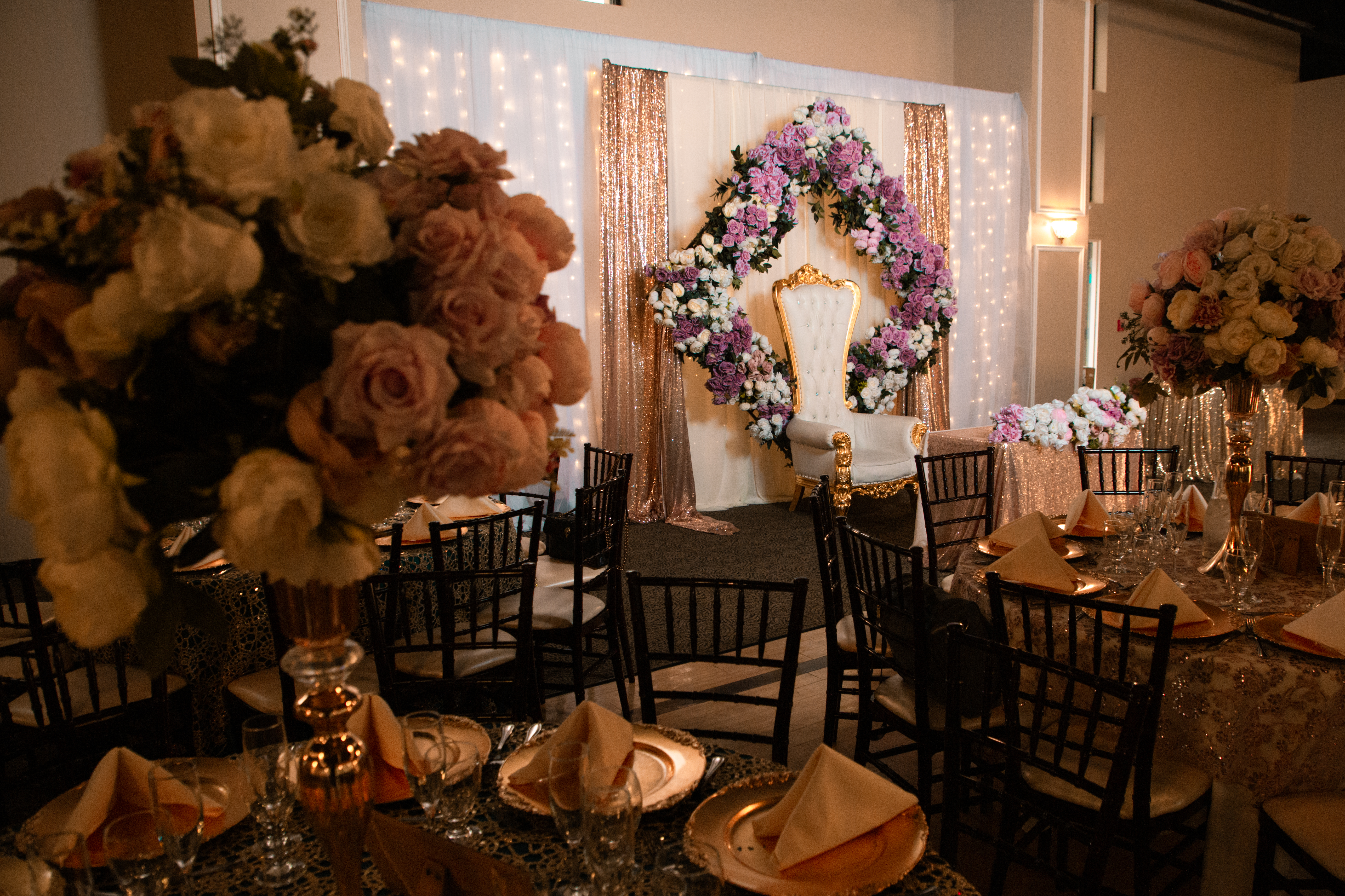 - Elegant quinceañera reception setup at Black Forest by Wedgewood Weddings in Colorado with floral wreath backdrop and gold decor