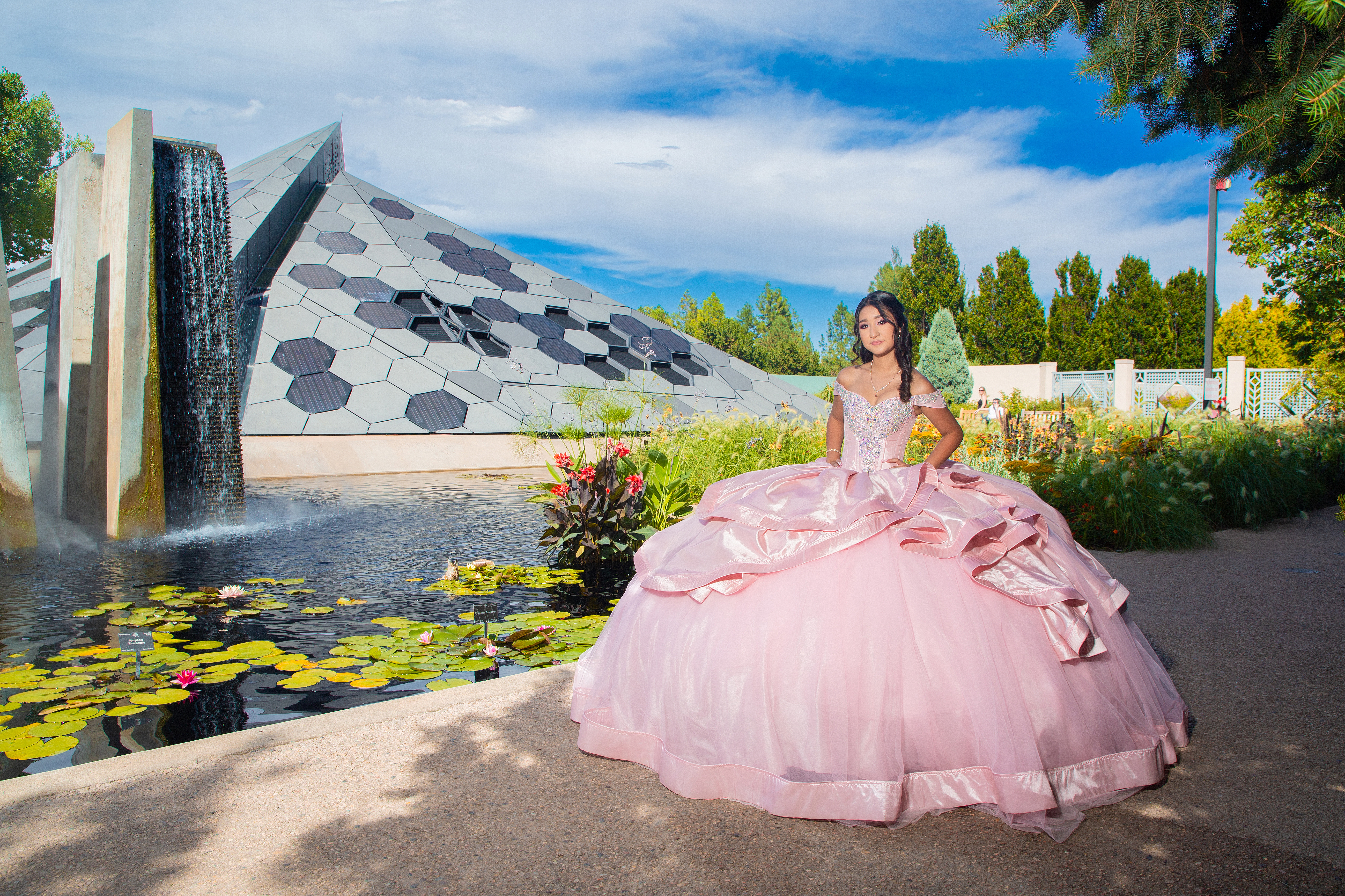 - Quinceañera in pink dress at Denver Botanical Gardens posing near waterfall and lily pond in Colorado