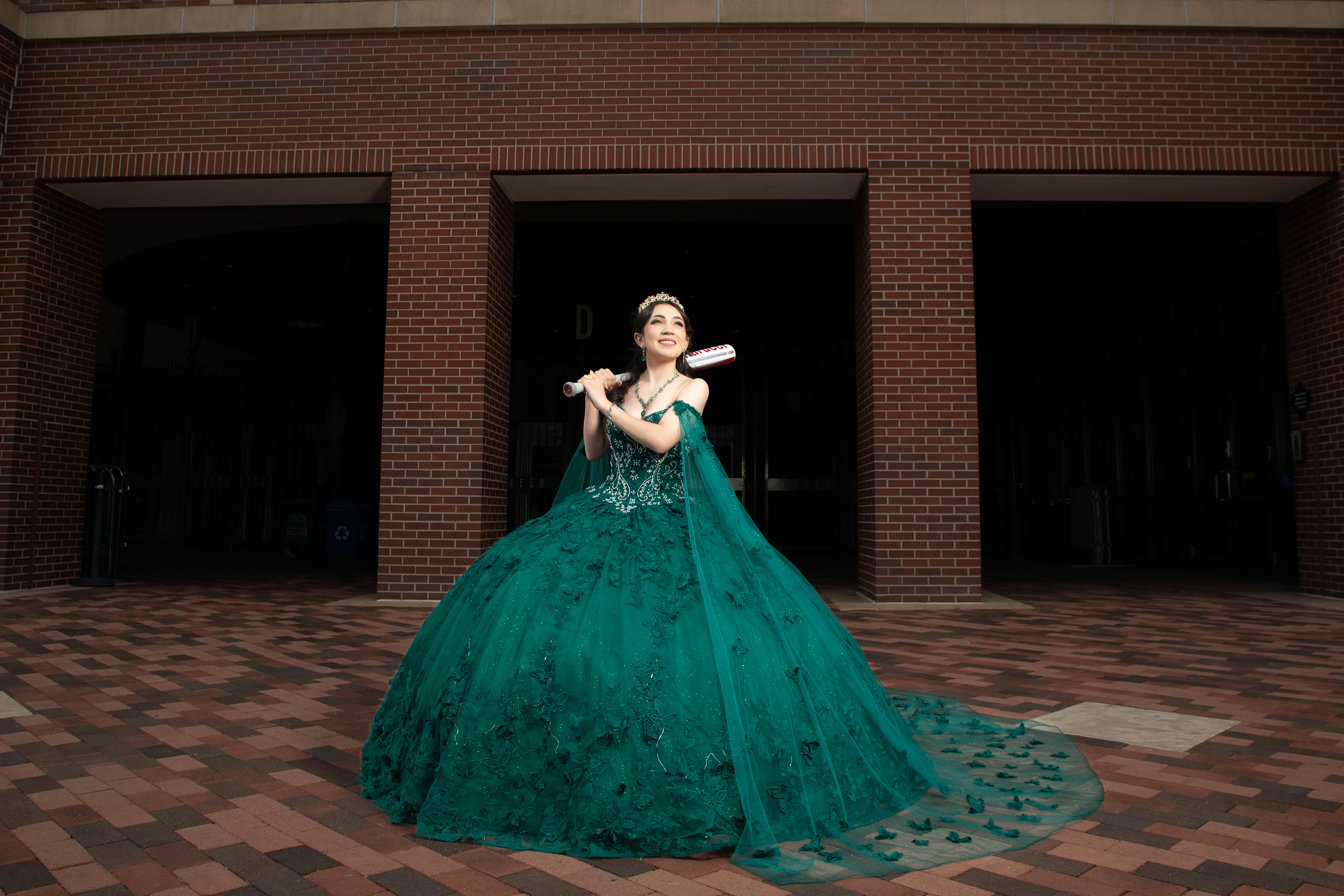 - Quinceañera photoshoot at Coors Field in Denver featuring an emerald green ball gown and baseball bat for a unique sports-themed portrait.