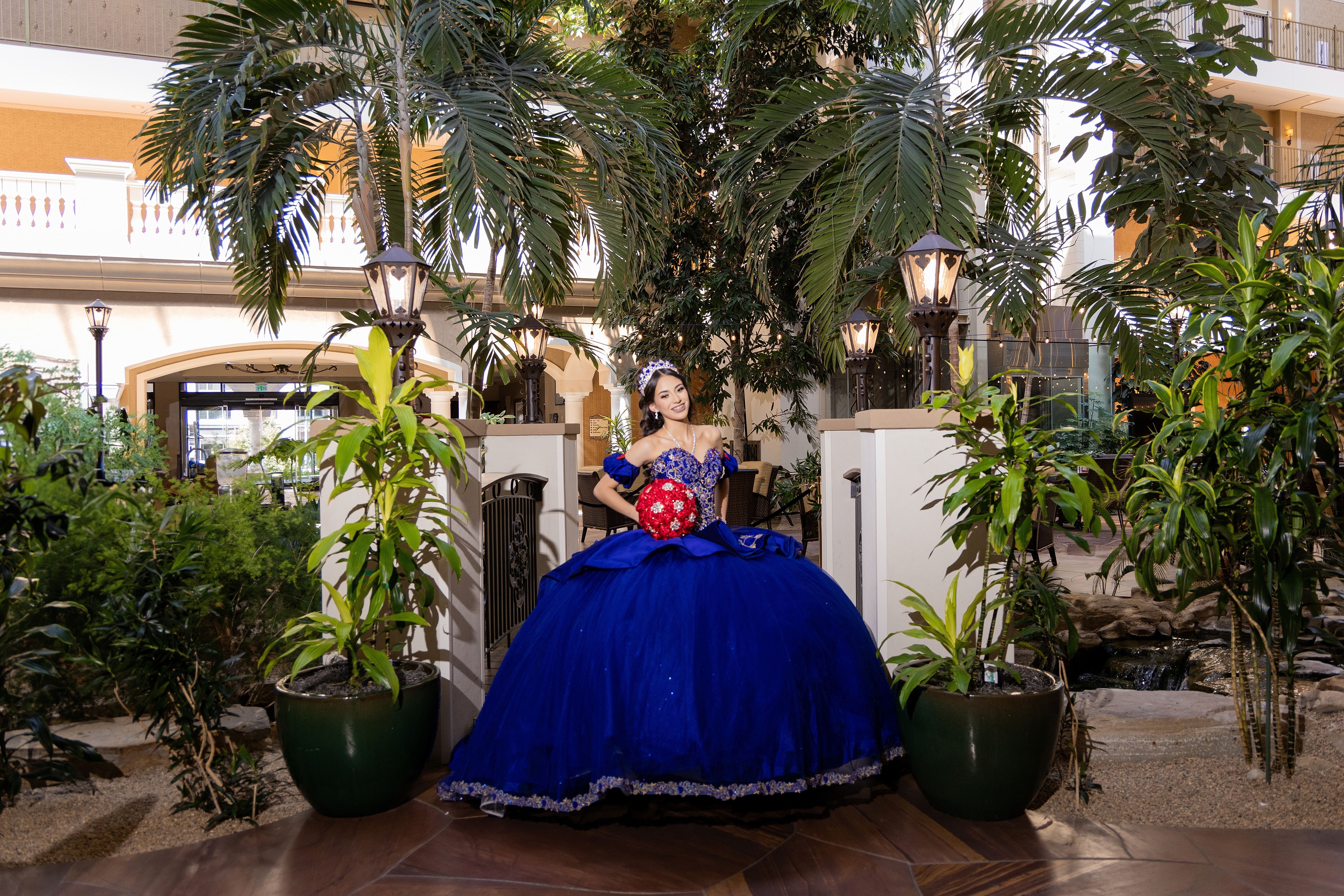 - Quinceañera portrait at Woolley’s Classic Suites lobby in Denver featuring a royal blue ball gown surrounded by tropical plants and elegant hotel architecture.