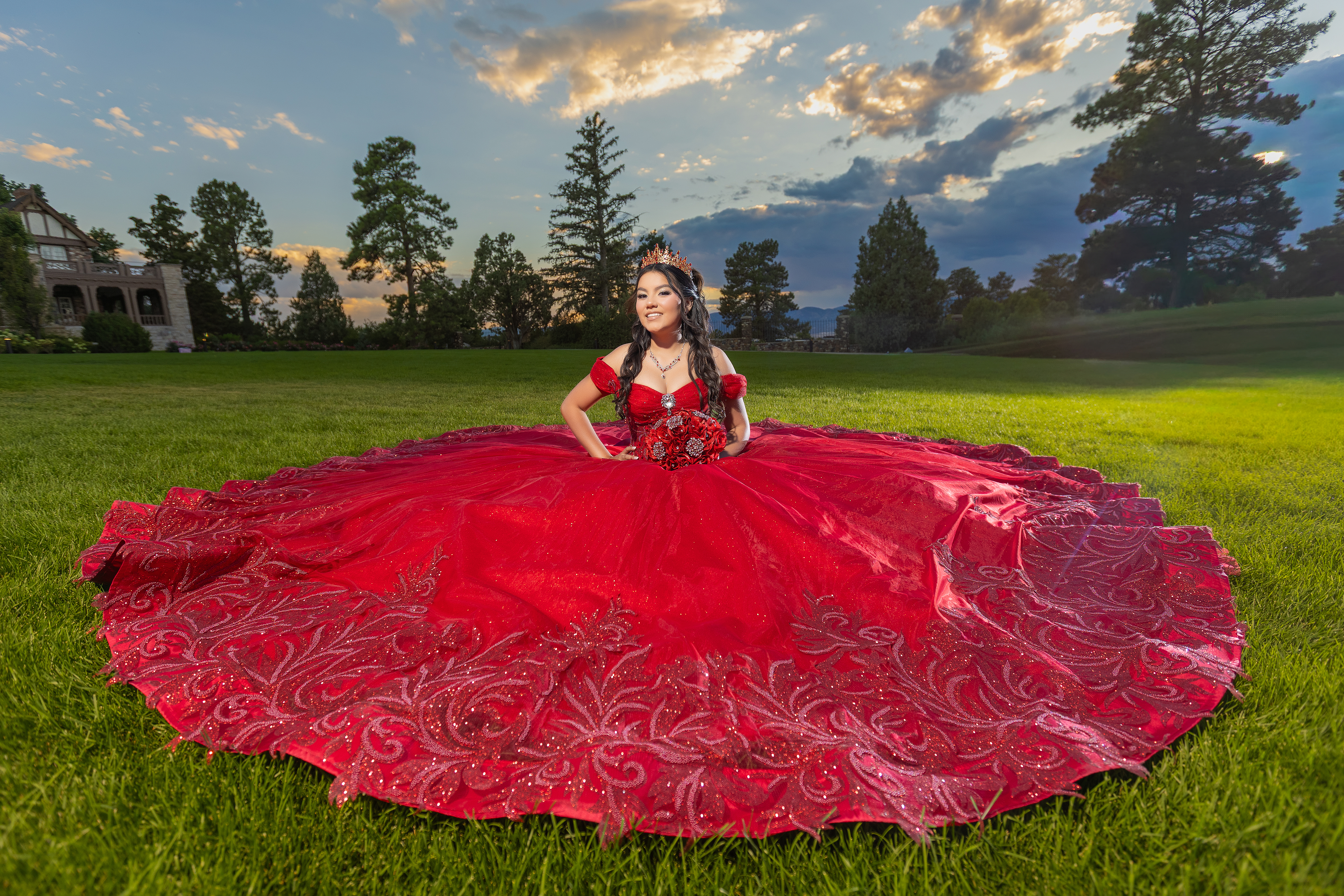 - Quinceañera wearing a red princess dress posing on the lawn at Highlands Ranch Mansion during a sunset quinceañera photoshoot in Colorado
