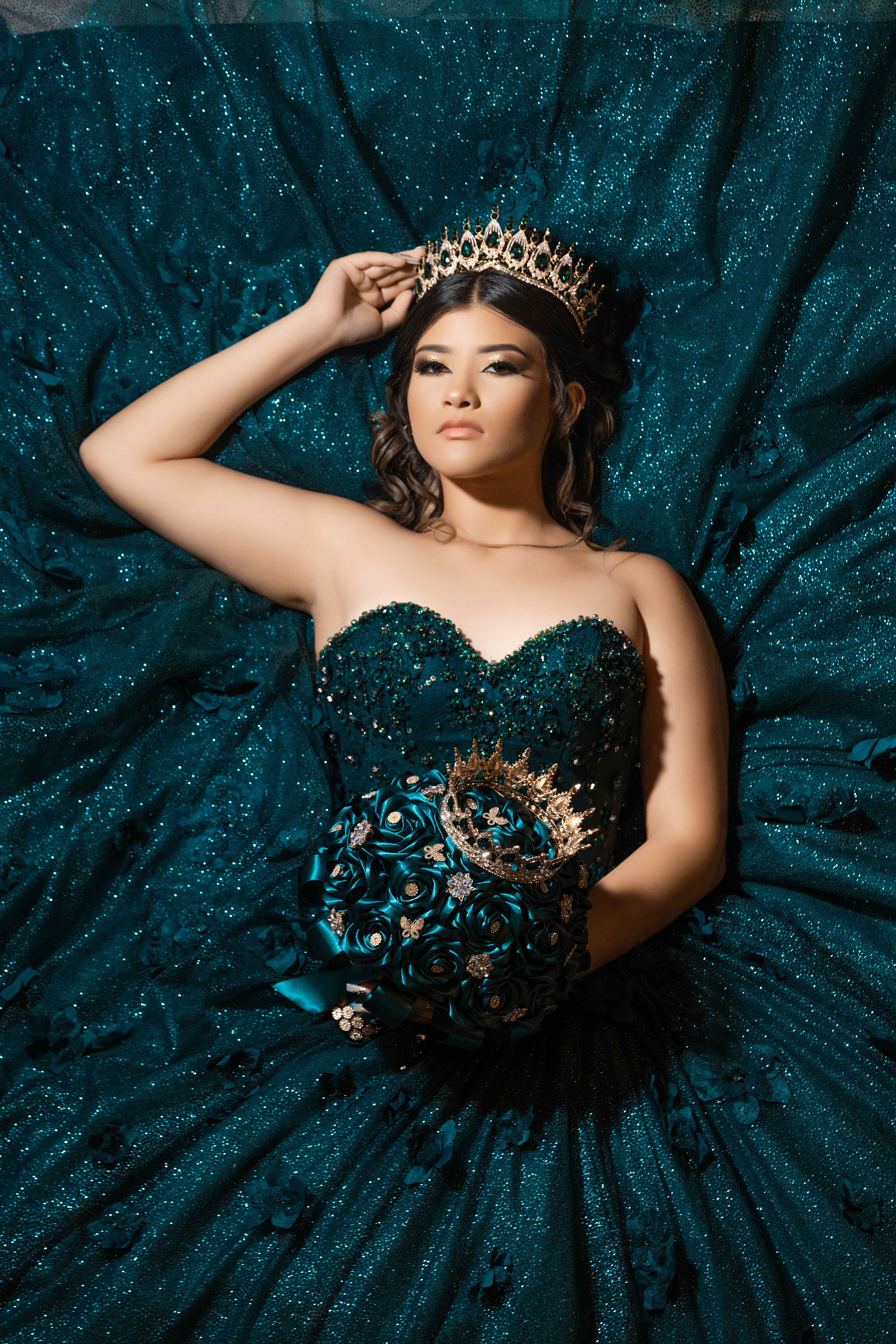 - Glamorous quinceañera portrait in an emerald green strapless dress with crown and bouquet, luxury studio photography