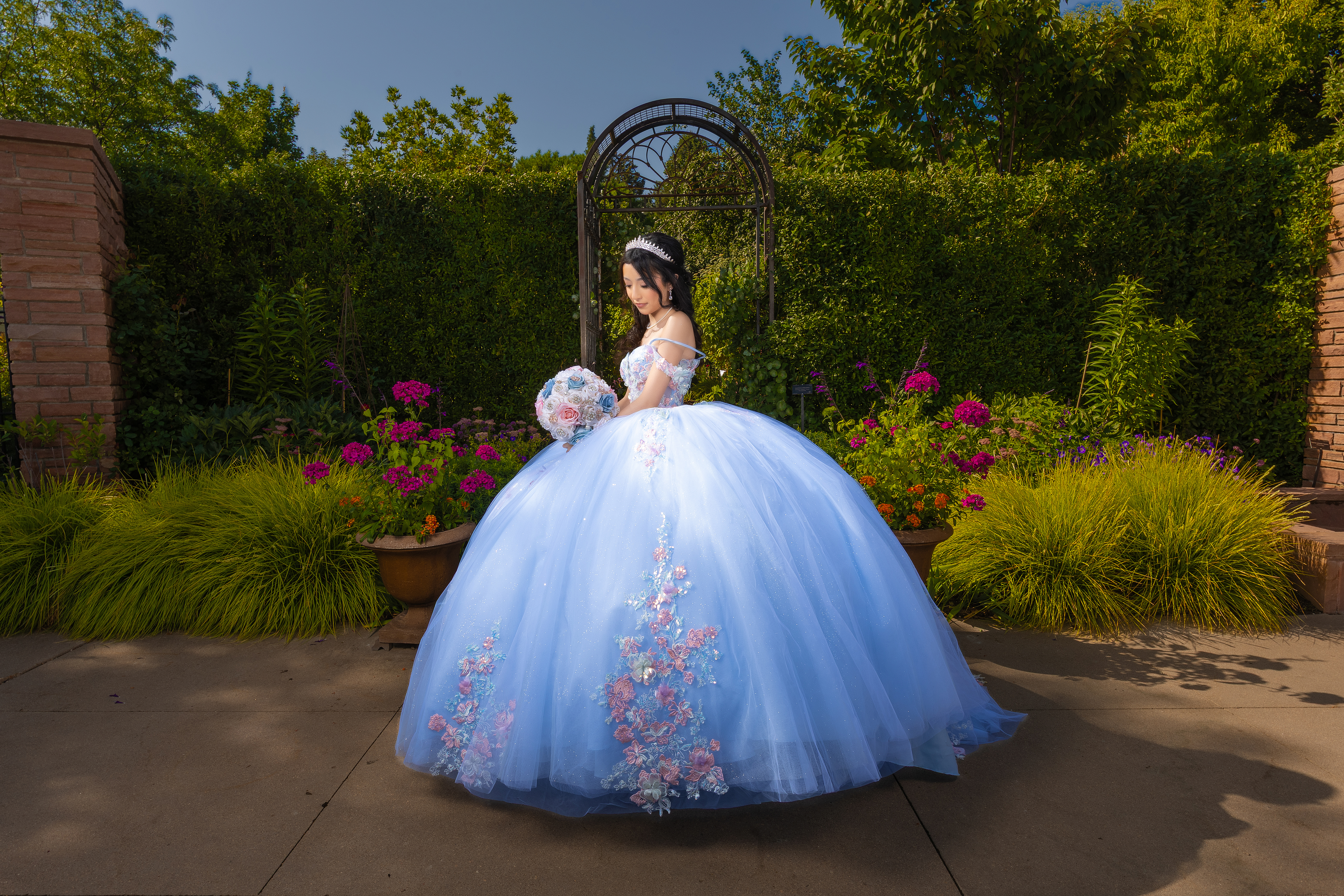 - Quinceañera wearing a light blue princess dress posing in a garden courtyard at the Denver Botanic Gardens during a quinceañera photoshoot in Denver Colorado