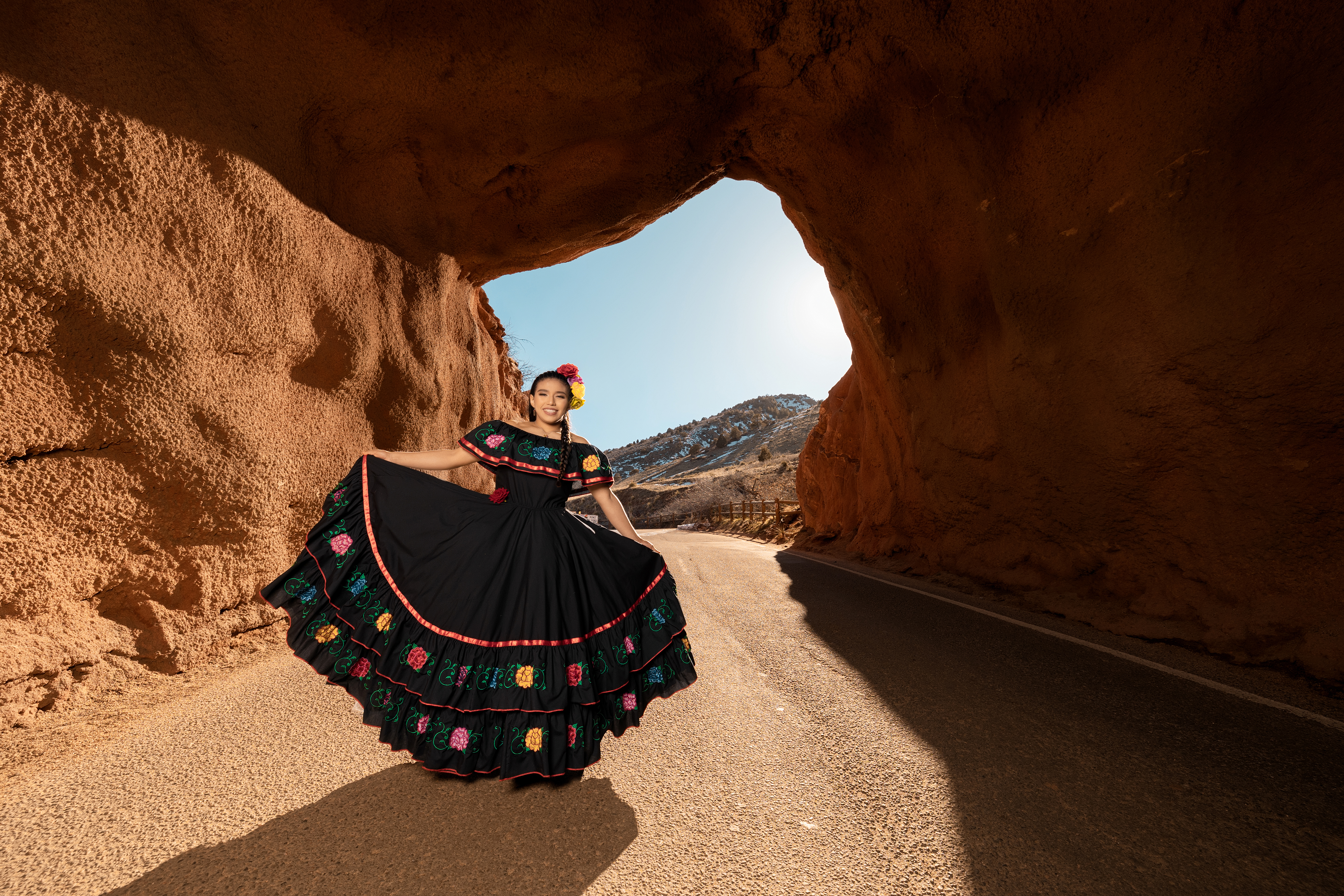 - Quinceañera wearing a traditional black embroidered dress at Red Rocks in Denver Colorado during golden hour photoshoot