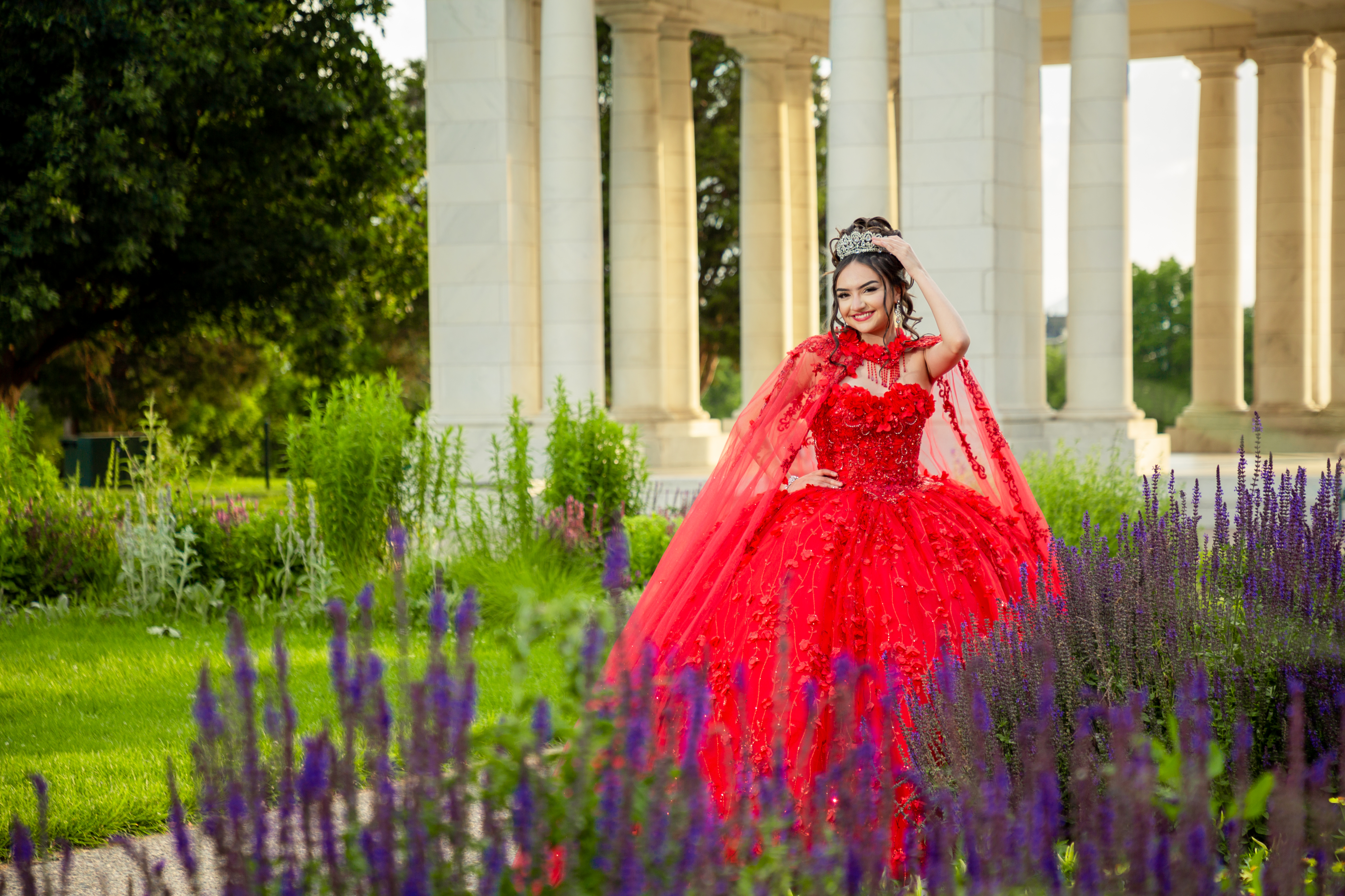 - Quinceañera in red dress at Cheesman Park in Denver posing near white columns and purple flowers