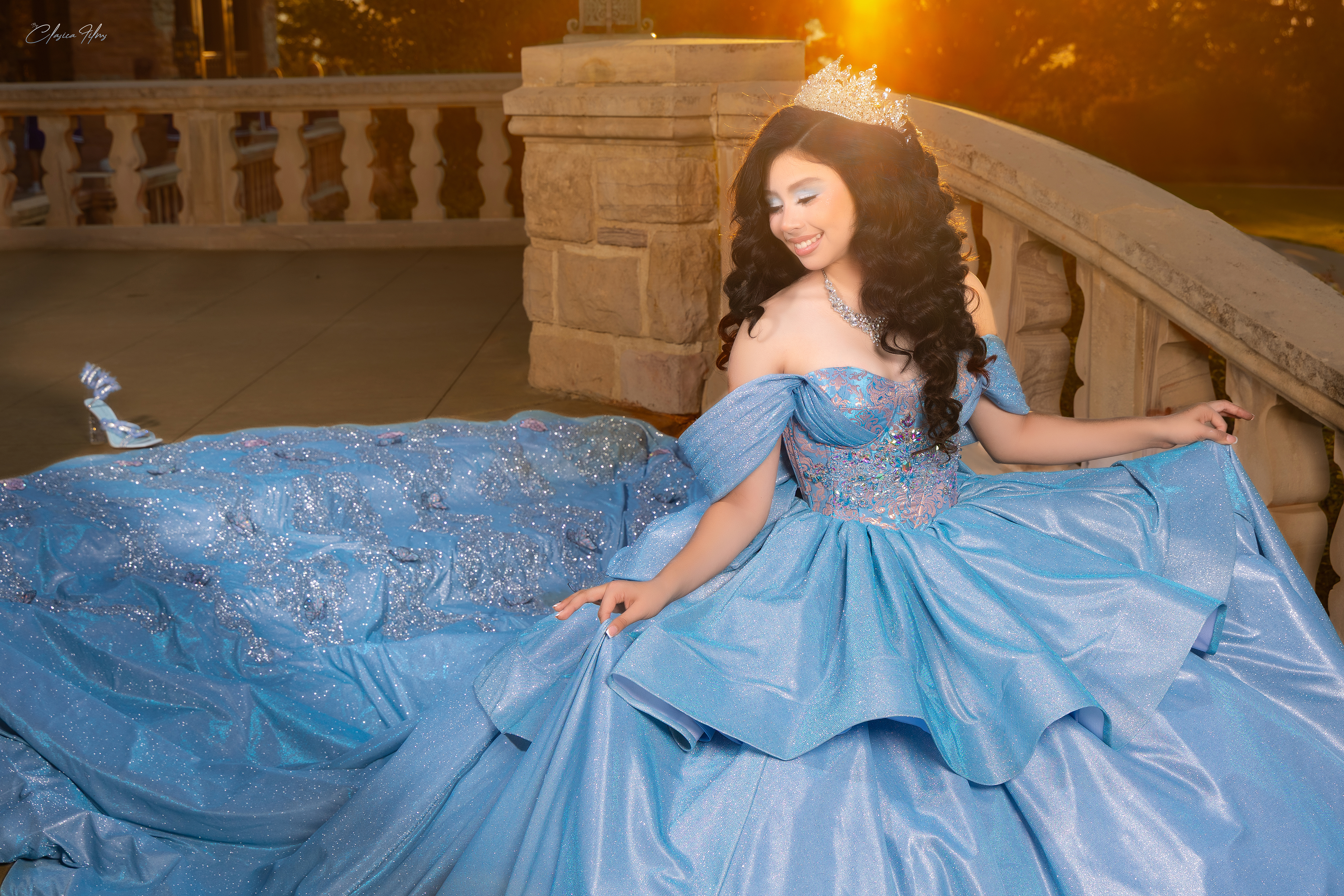 - Blue quinceañera dress photoshoot at Highlands Ranch Mansion in Colorado during golden hour captured by a Denver quinceañera photographer.