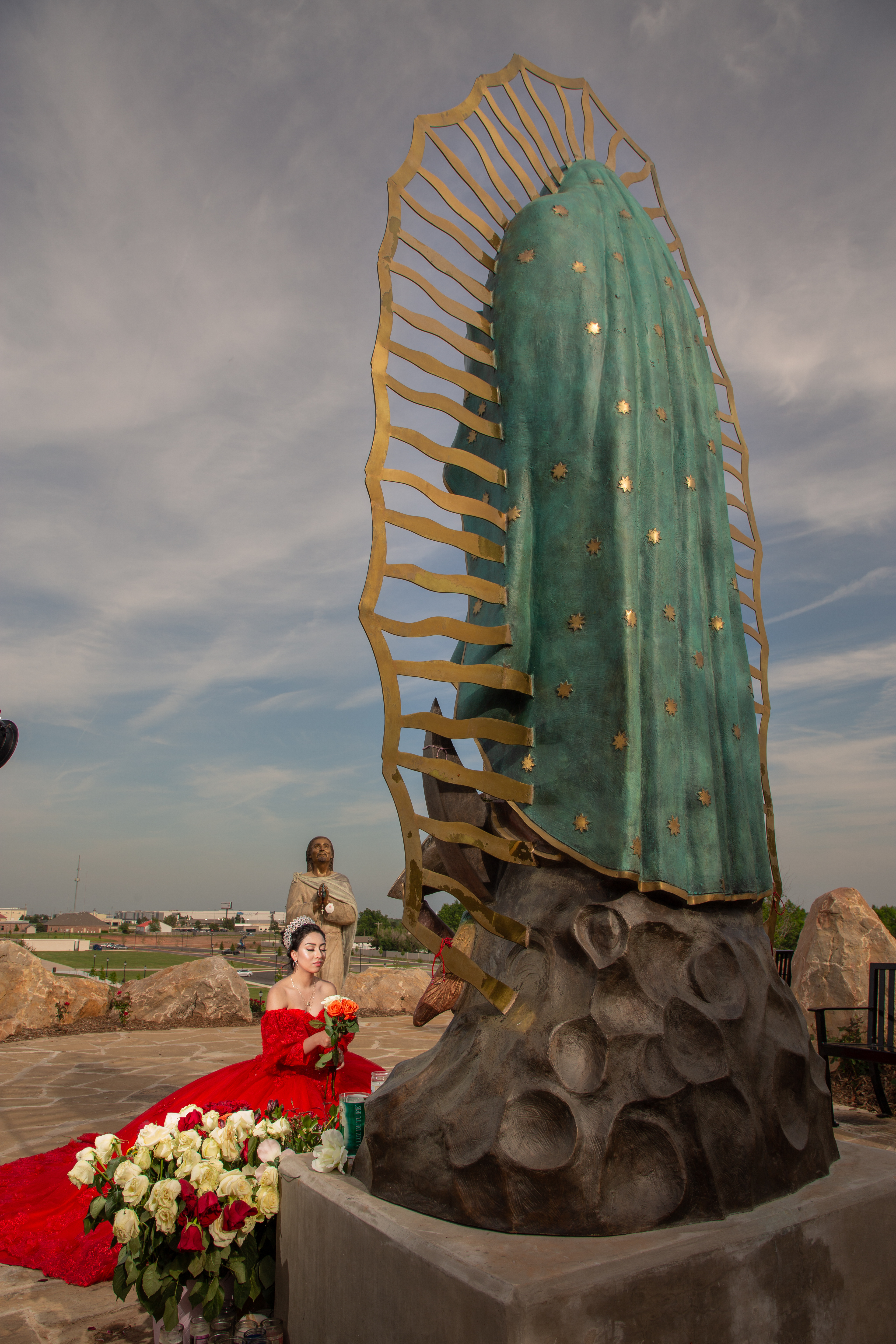 - Quinceañera in red dress praying at Virgen Maria statue at Tepeyac in Oklahoma City OK