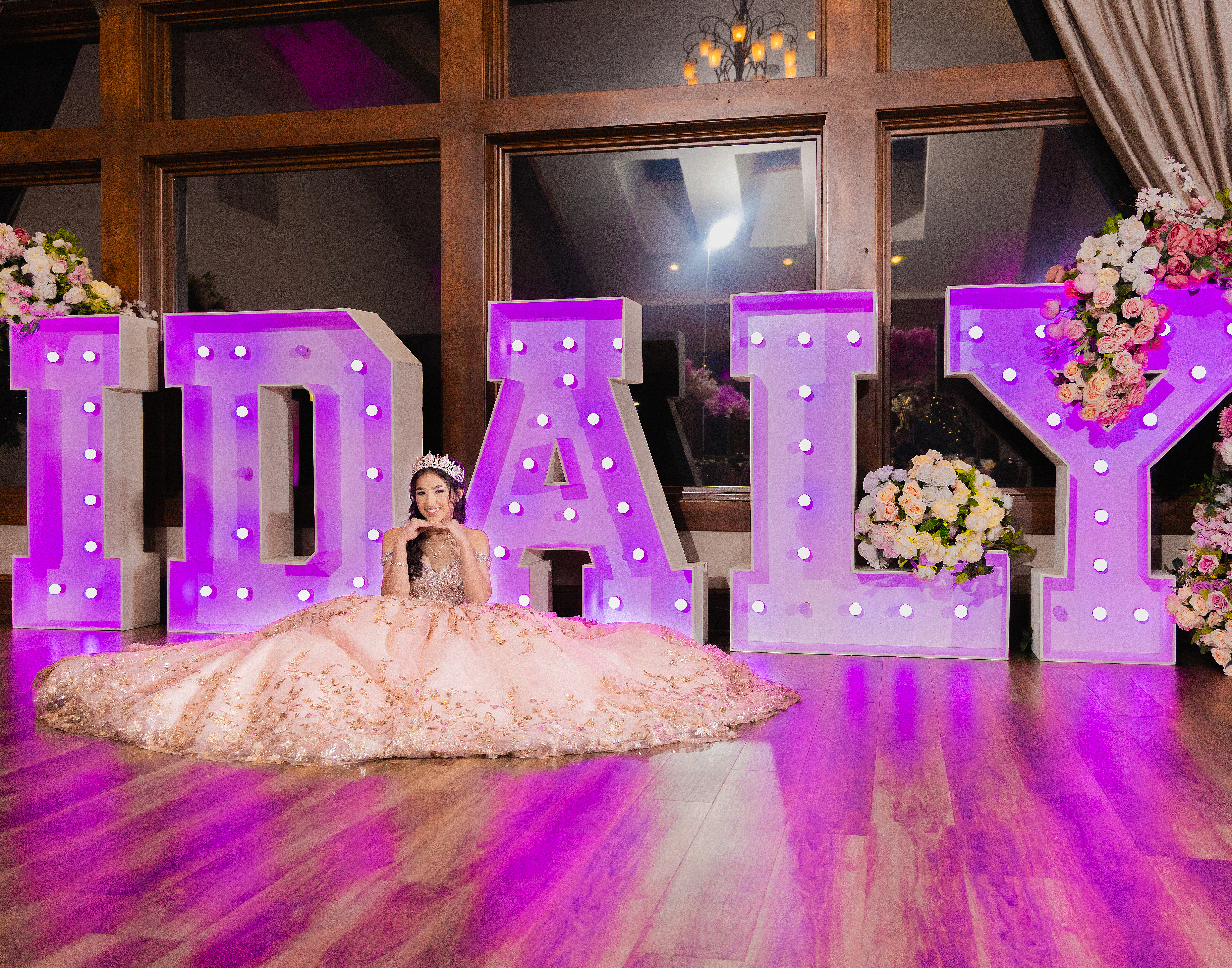 - Quinceañera posing in blush pink dress in front of large illuminated XV letters at indoor event venue