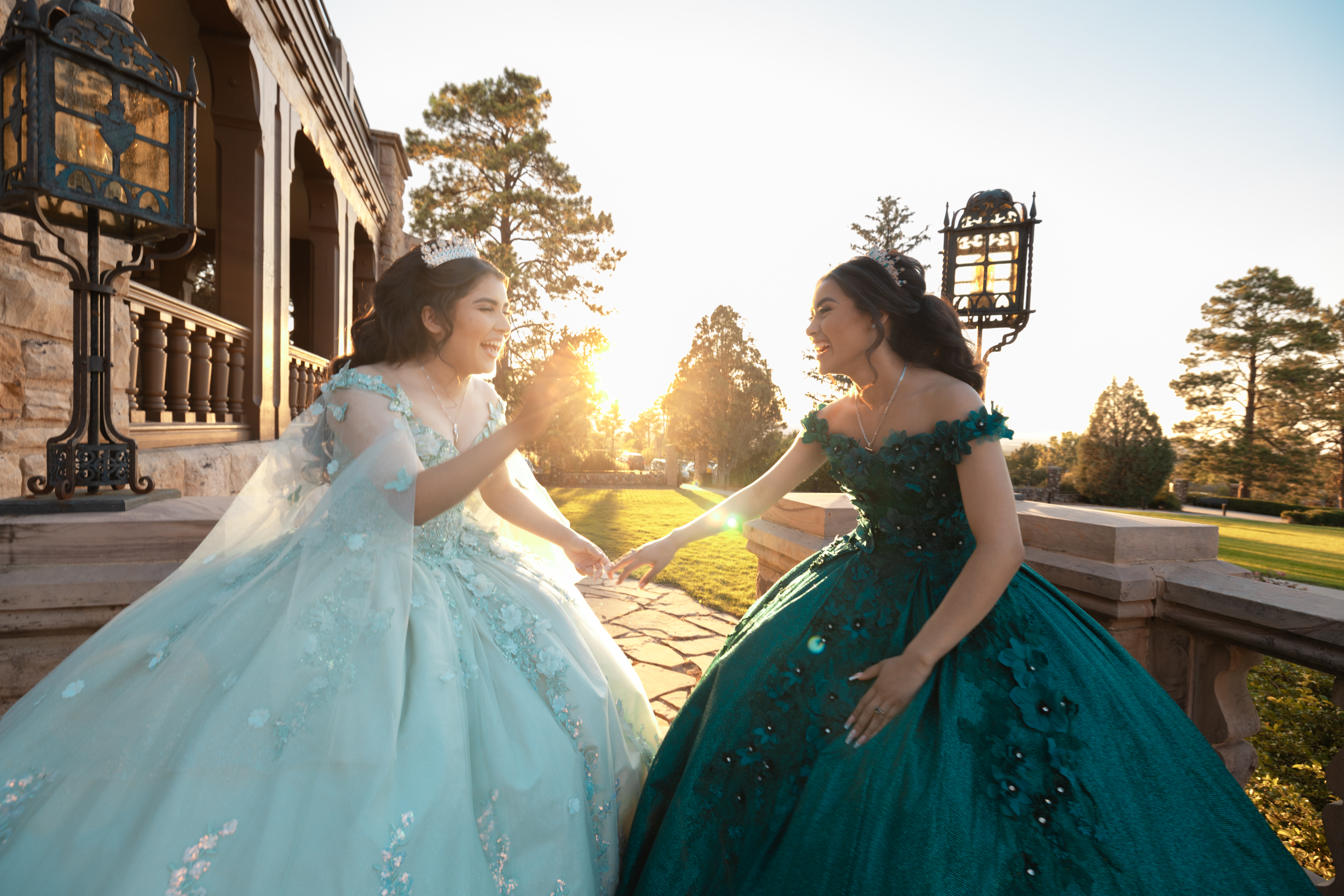 - Two quinceañeras in elegant pastel and emerald green dresses laughing together during golden hour at a Denver estate