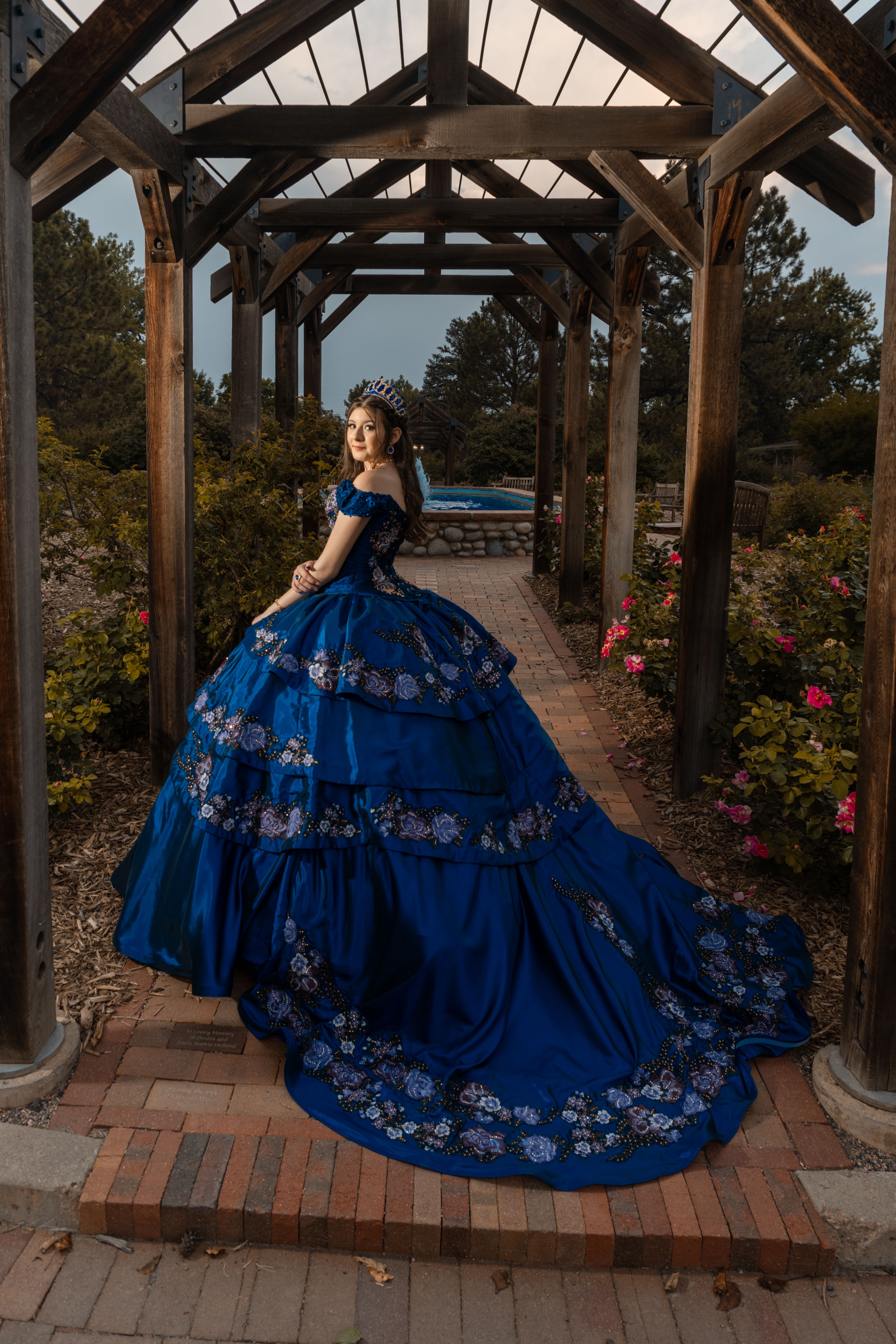 - Navy blue quinceañera photoshoot at Hudson Gardens in Littleton Colorado featuring an elegant princess gown under a wooden garden pergola.