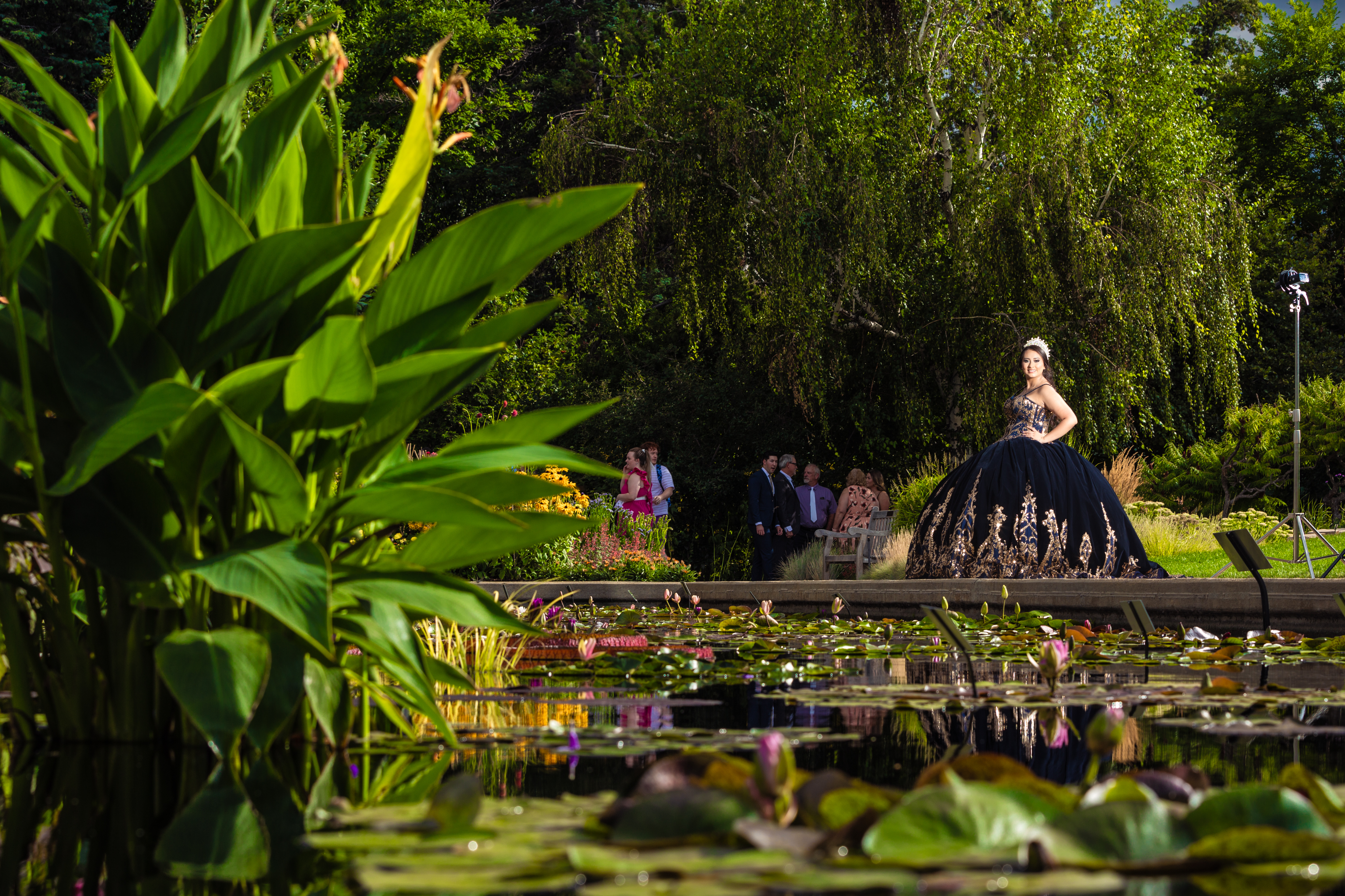- Quinceañera in navy blue dress posing near lily pond at Denver Botanic Gardens