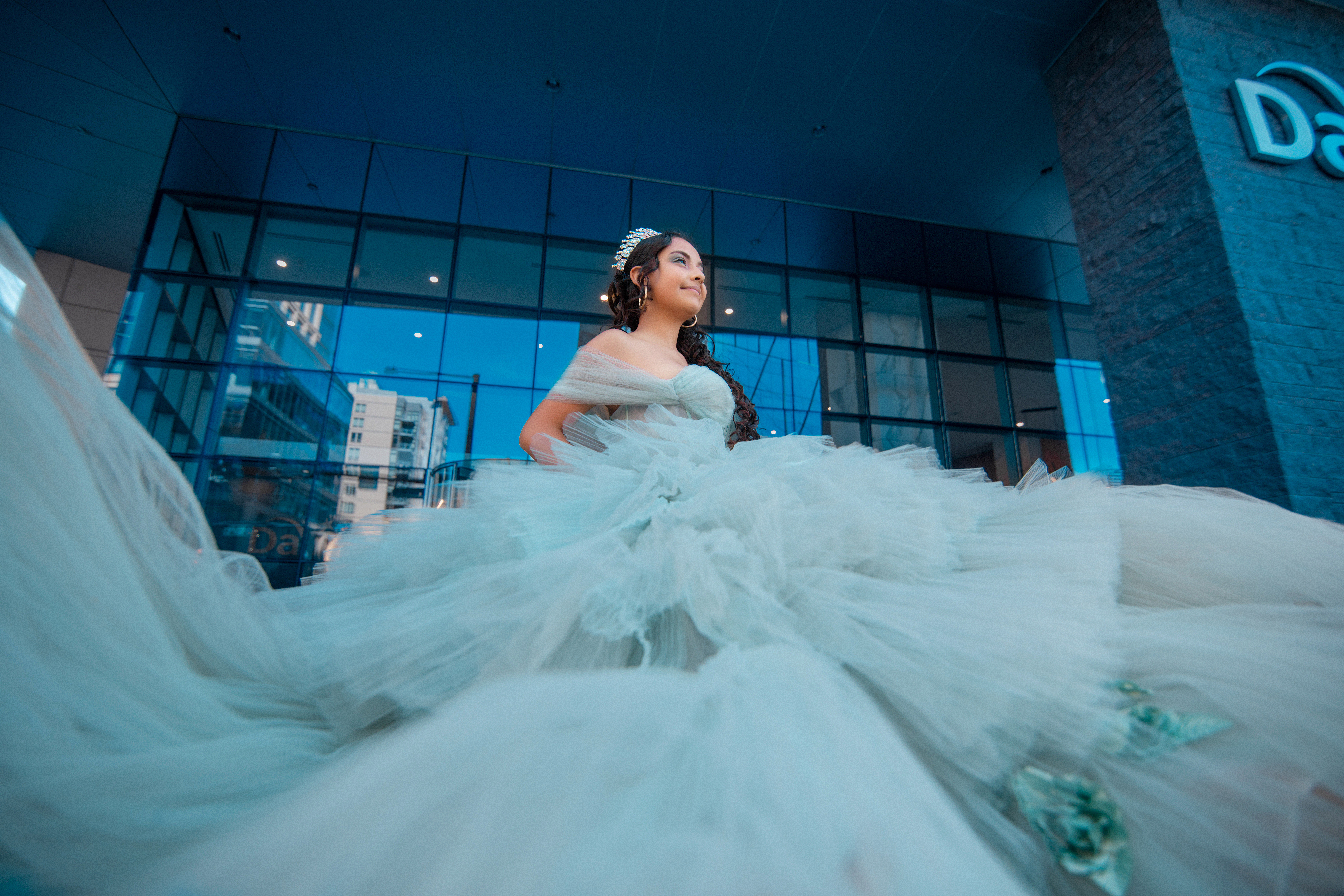 - Quinceañera photoshoot at Millennium Bridge on 16th Street Mall in downtown Denver featuring a light blue princess dress with dramatic tulle.