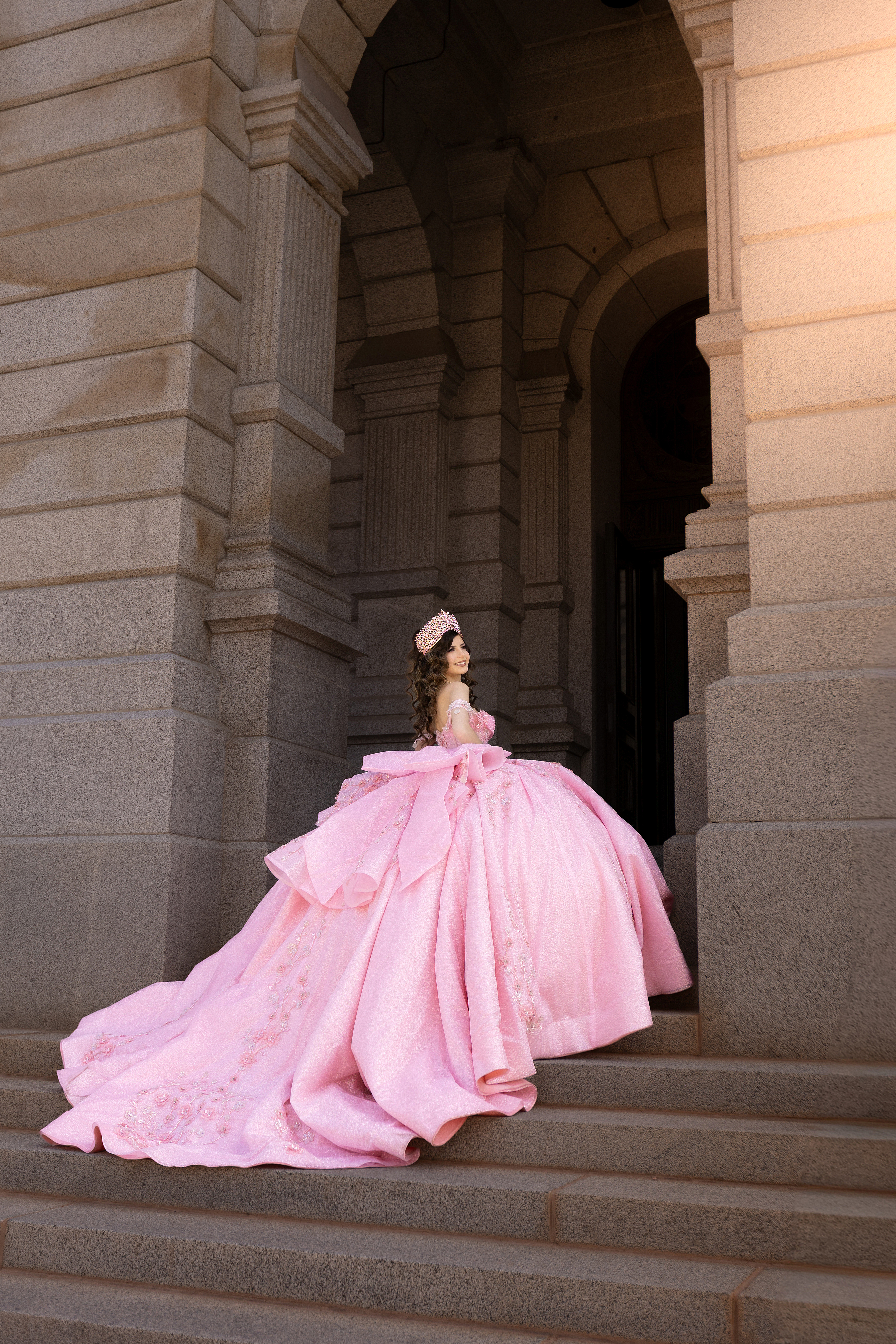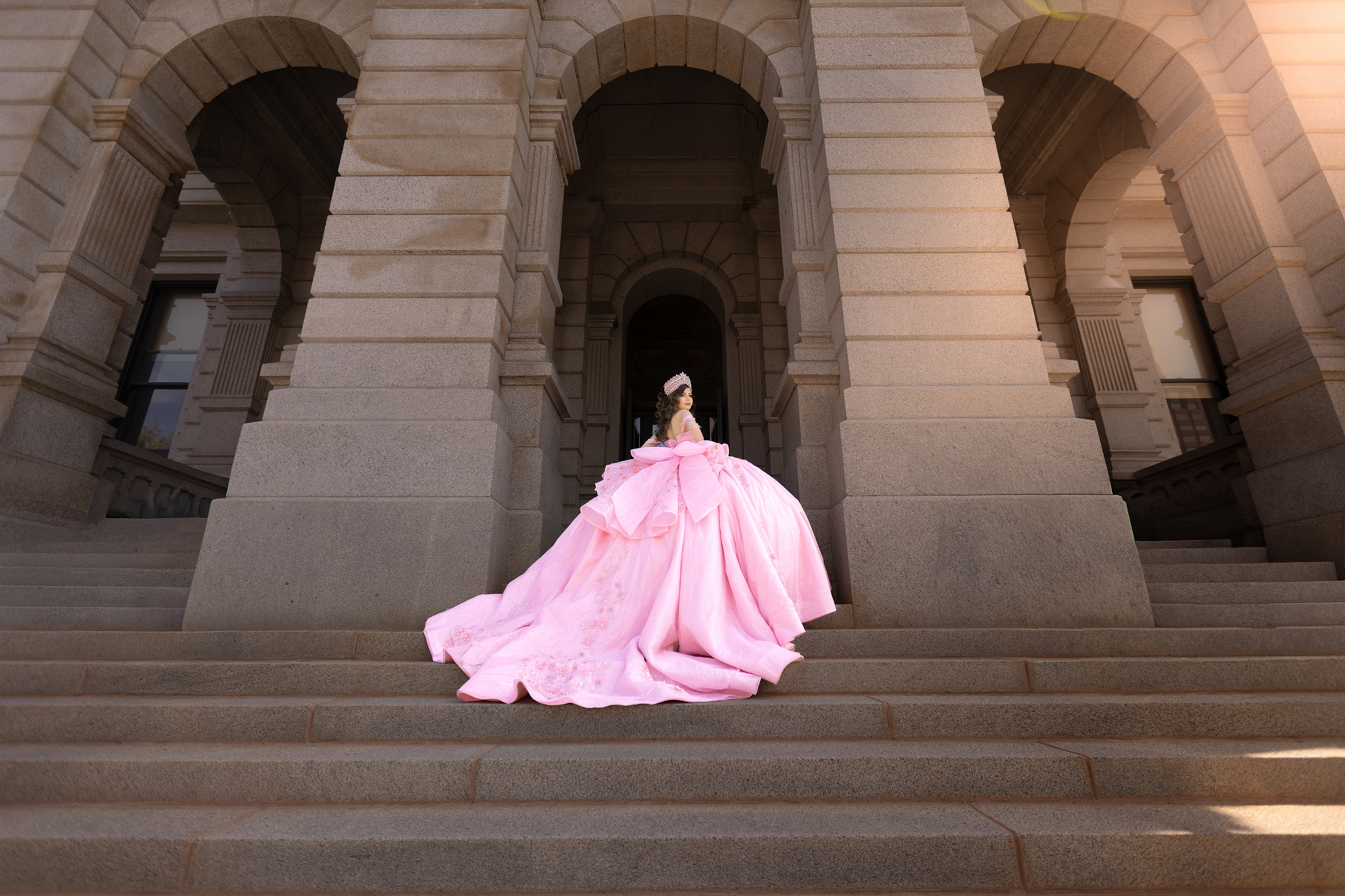 - Quinceañera in a pink princess dress with long train posing on the steps of the Colorado State Capitol in Denver