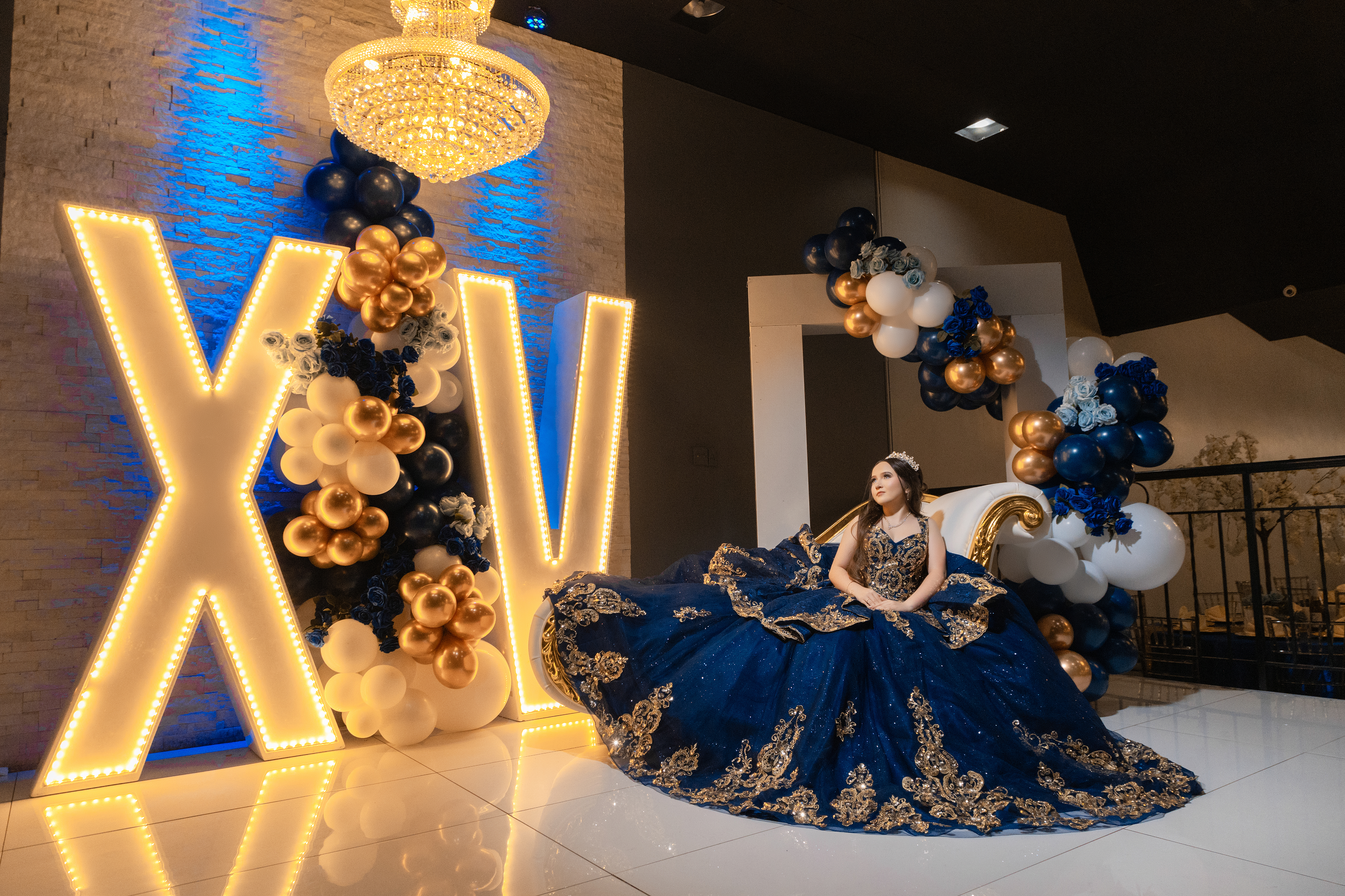 - Quinceañera in a navy blue dress posing at Madrid Event Center with illuminated XV letters and balloon decoration backdrop