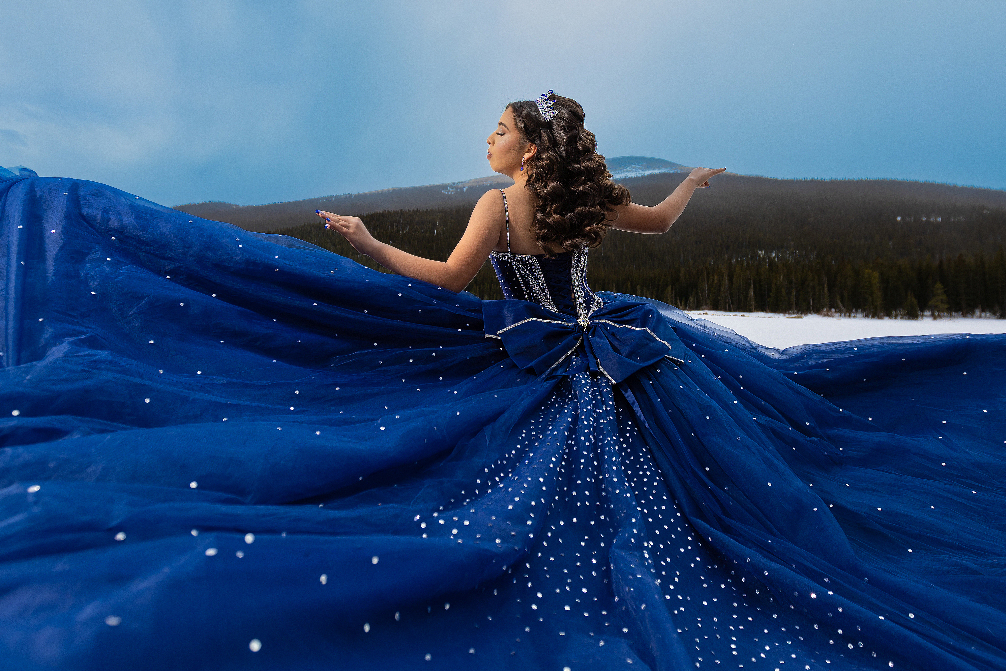 - Quinceañera wearing a royal blue dress posing at Echo Lake in Colorado during a snowy mountain quinceañera photoshoot