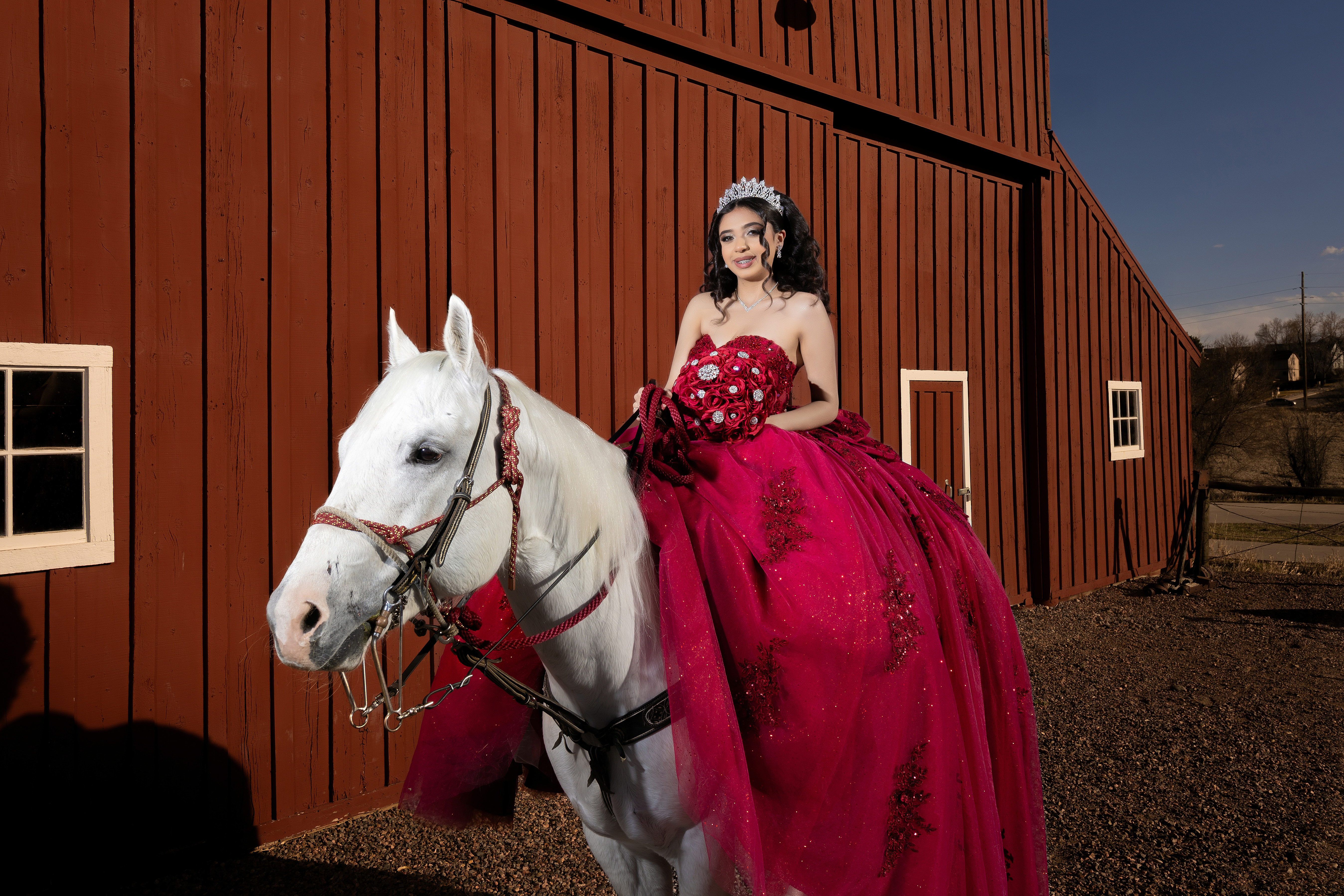 - Quinceañera in a red dress riding a white horse in front of the barn at Belmar Park in Lakewood Colorado