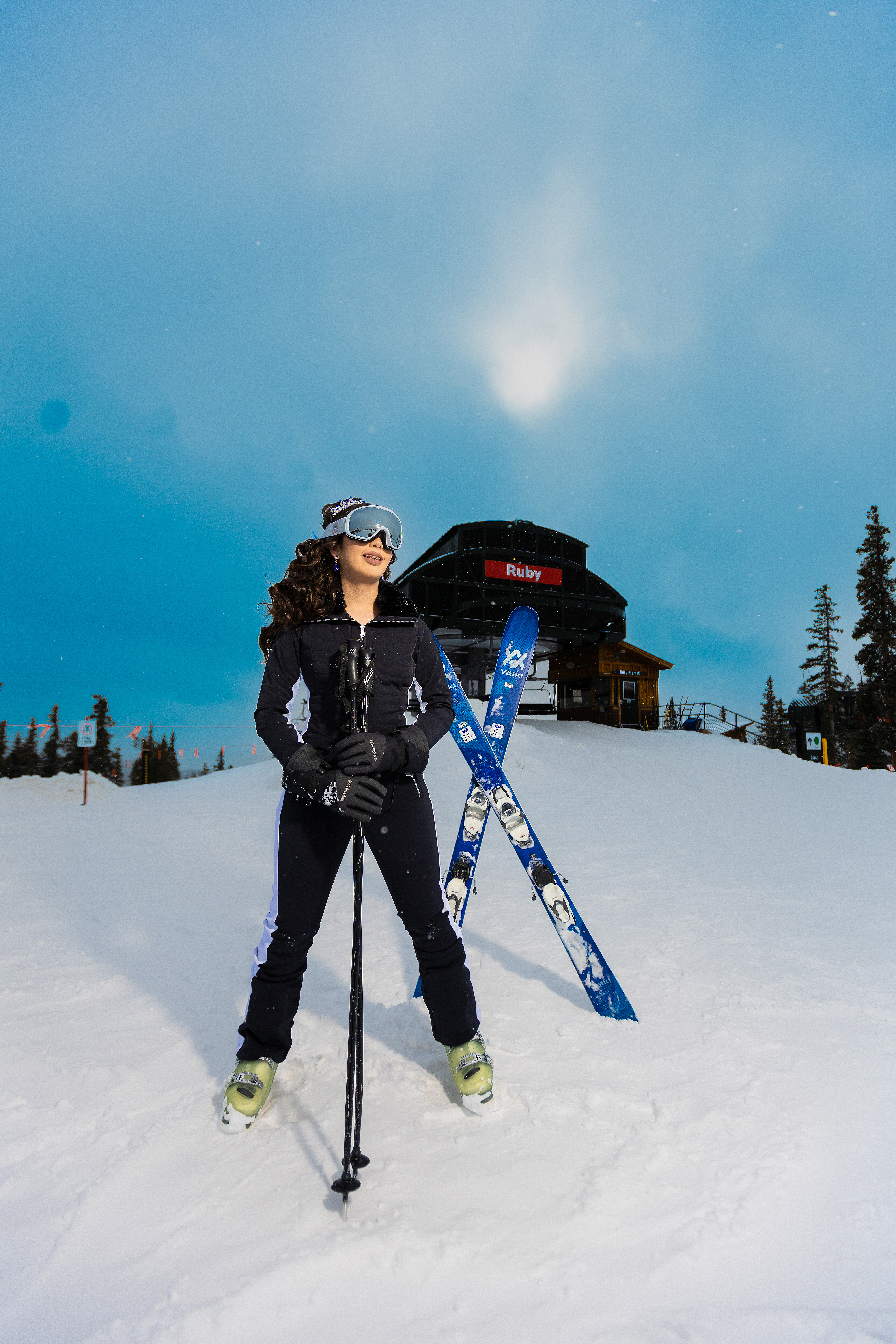- Quinceañera winter photoshoot at the top of Breckenridge Ski Resort in Colorado wearing ski gear in the snow