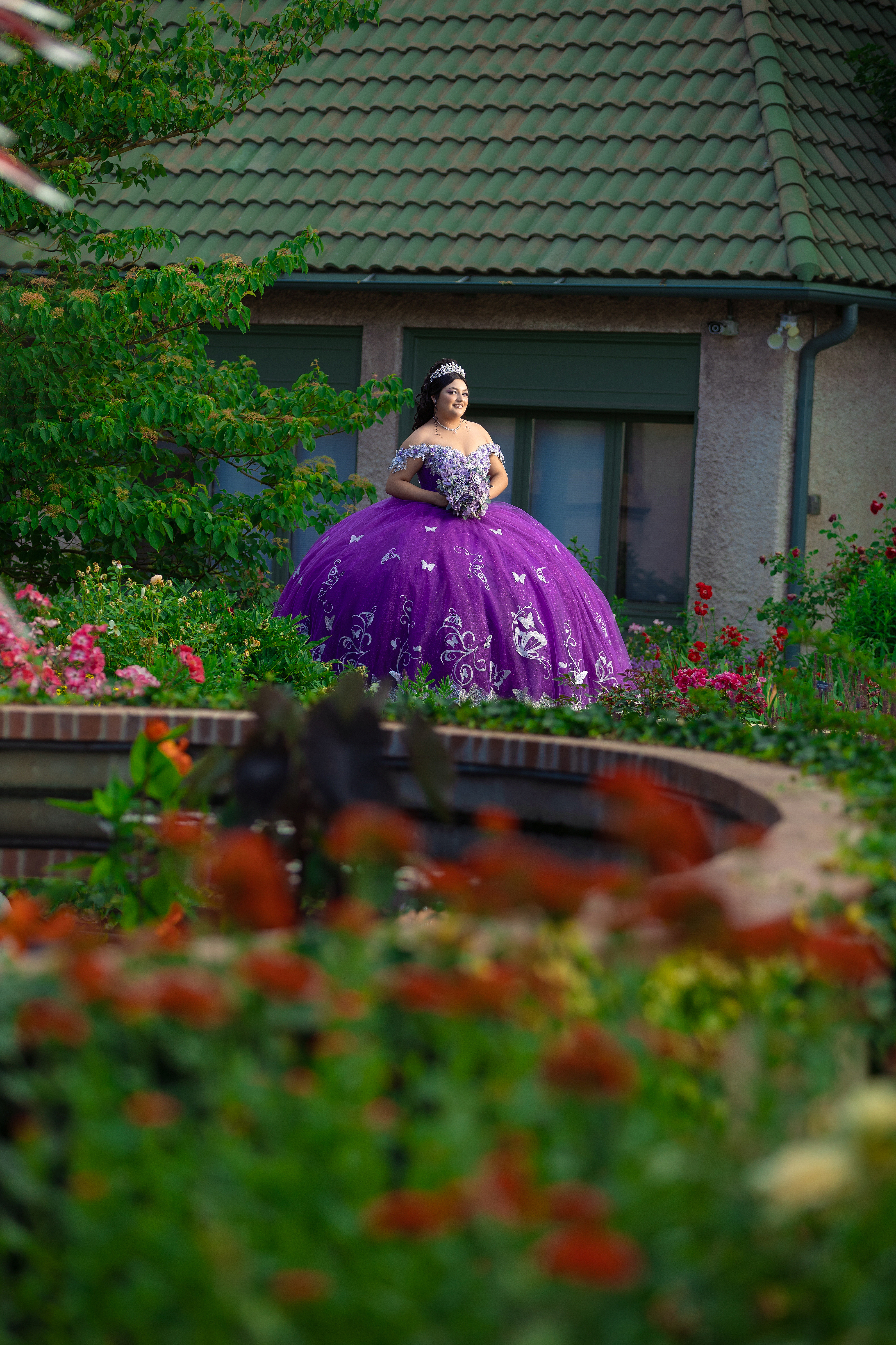 - Purple quinceañera dress photoshoot at Denver Botanic Gardens featuring elegant garden portraits in Denver Colorado.