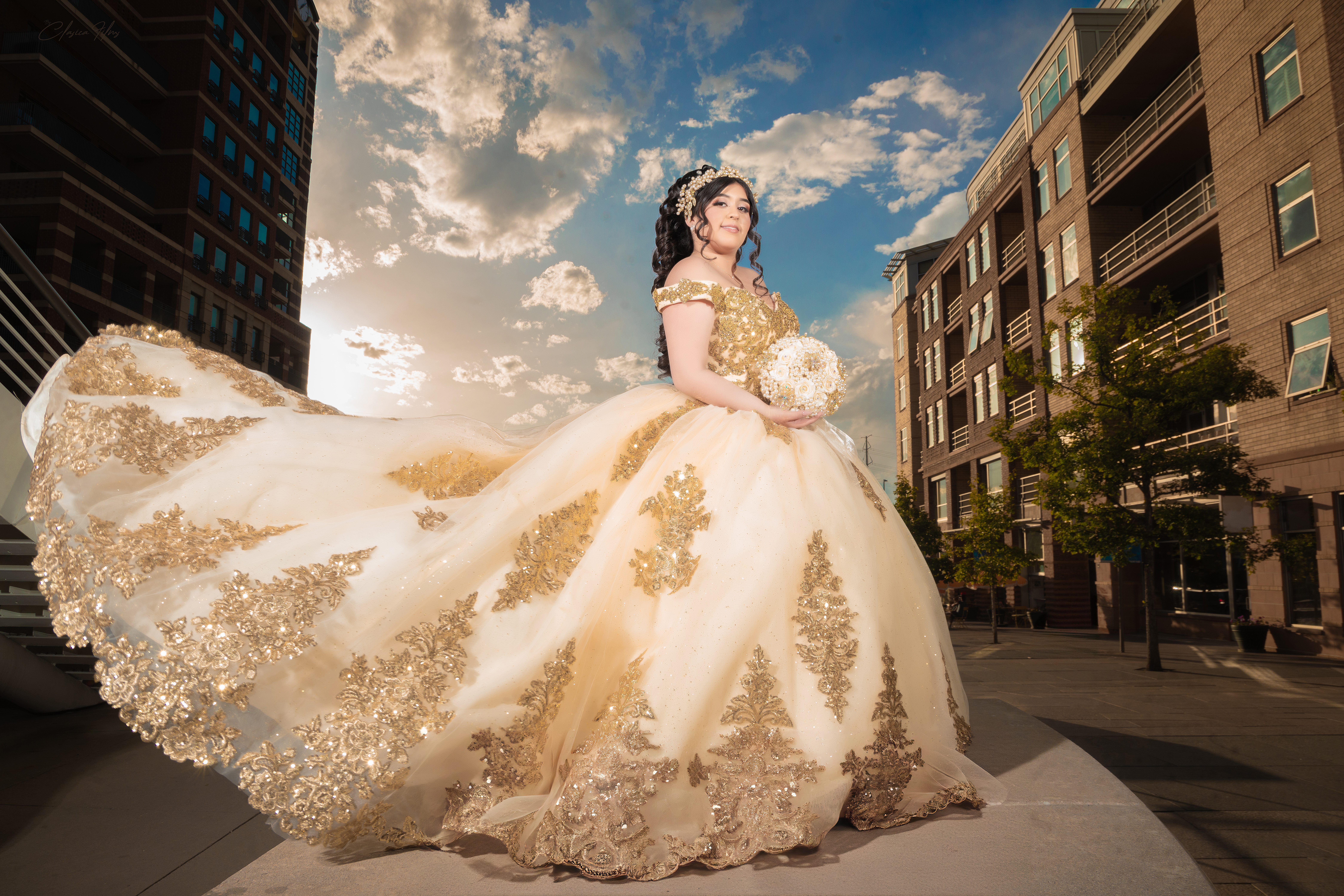 - Quinceañera photoshoot at 16th Street Mall and Millennium Bridge in downtown Denver featuring a gold and champagne ball gown during sunset.
