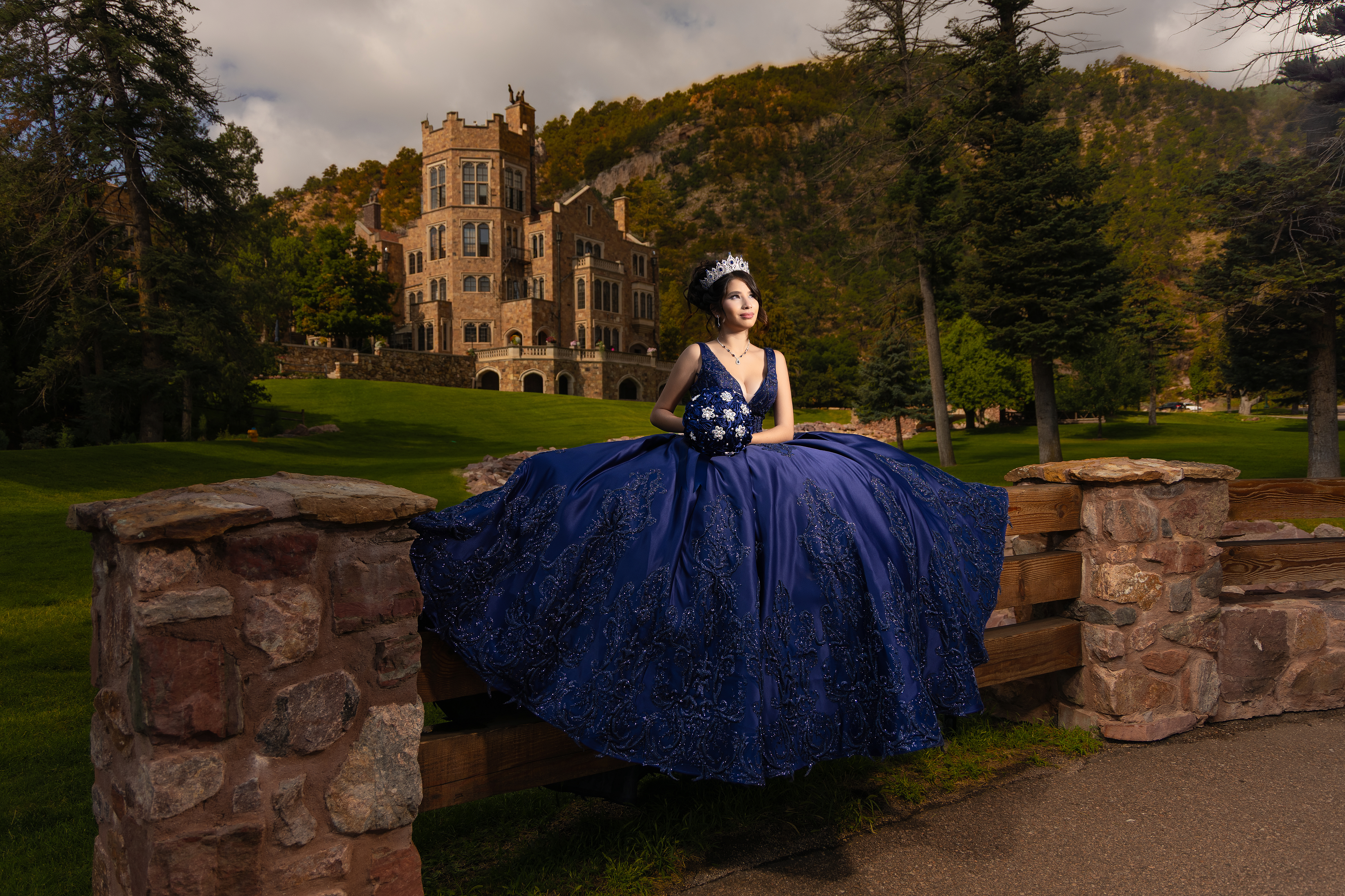 - Quinceañera in a navy blue dress posing at Glen Eyrie Castle in Colorado Springs with mountain backdrop