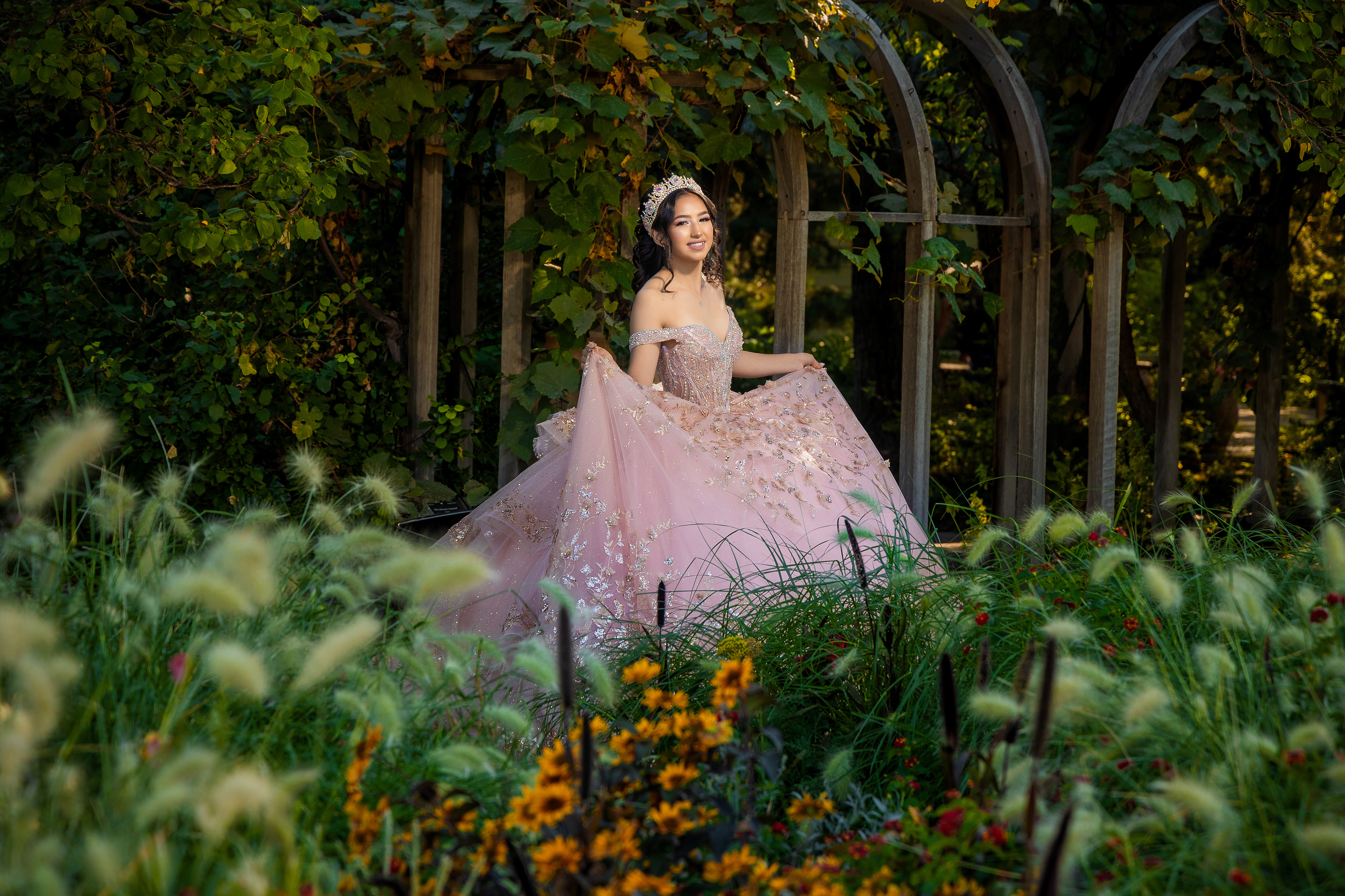 - Quinceañera in a blush pink dress posing inside a garden arch at Denver Botanic Gardens surrounded by lush greenery and flowers