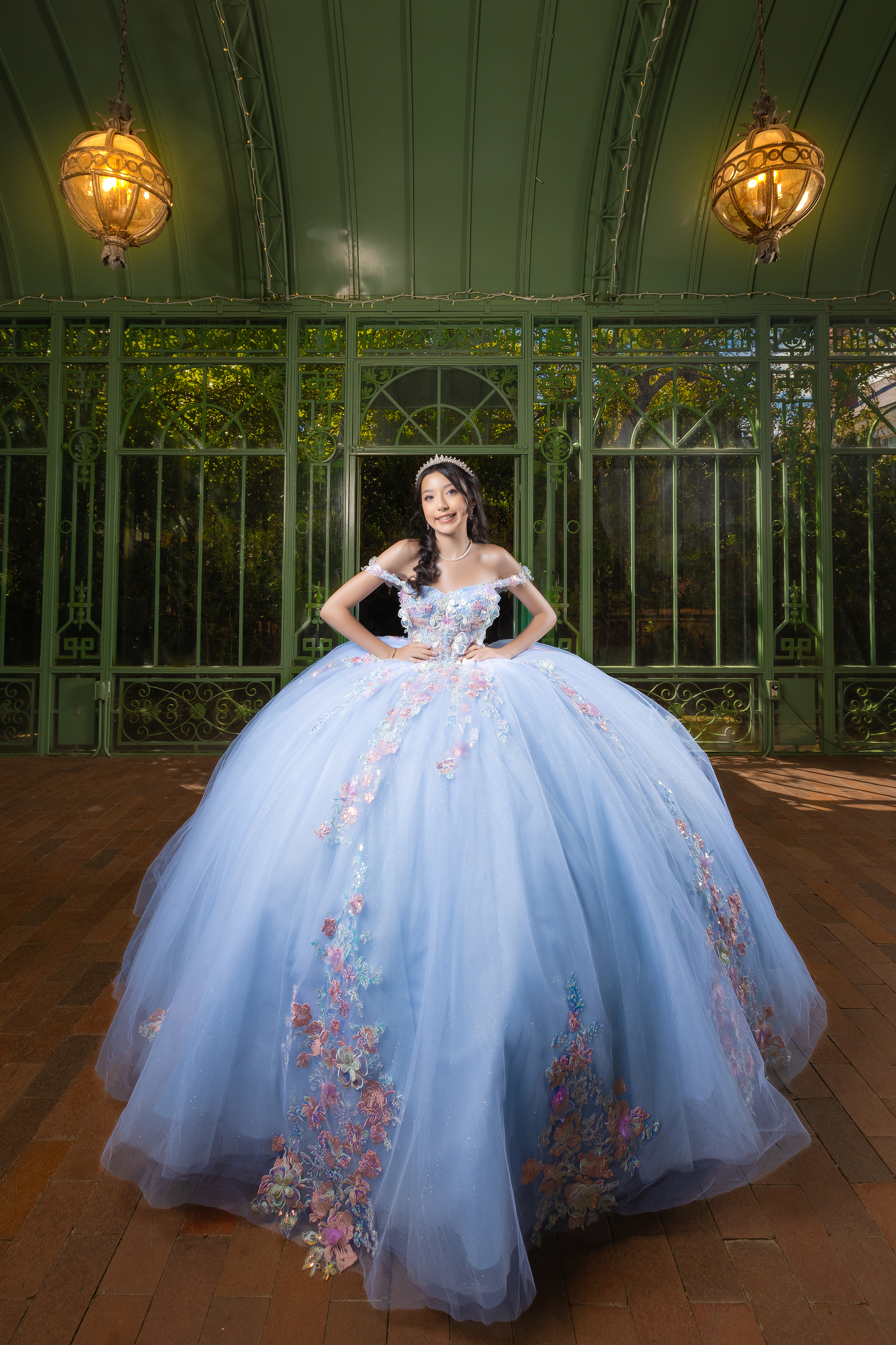 - Quinceañera in a light blue princess dress posing inside the Denver Botanic Gardens conservatory during a luxury quinceañera photoshoot in Colorado