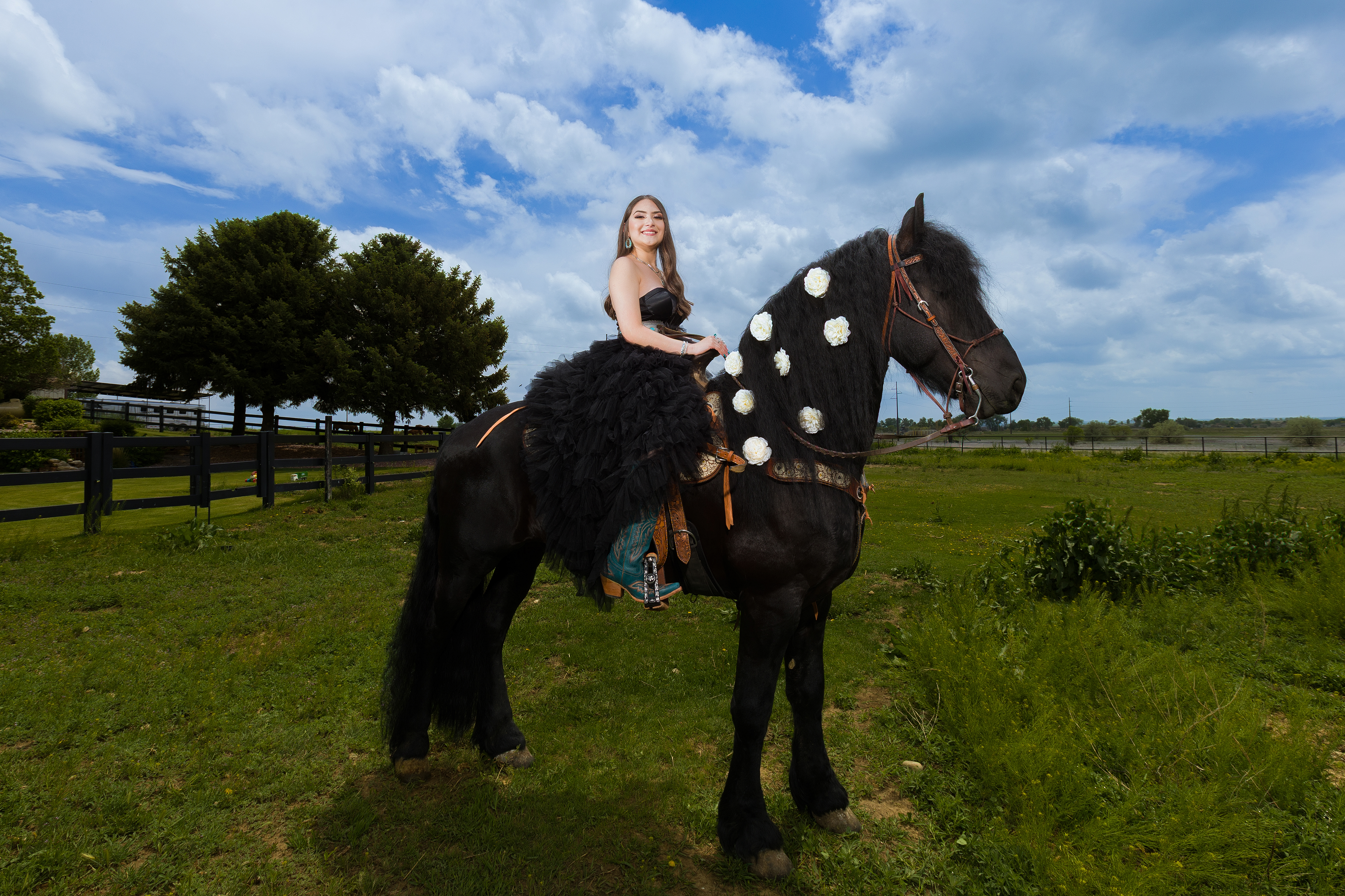 - Quinceañera riding a black horse during a ranch photoshoot in Denver Colorado wearing a black quinceañera dress.