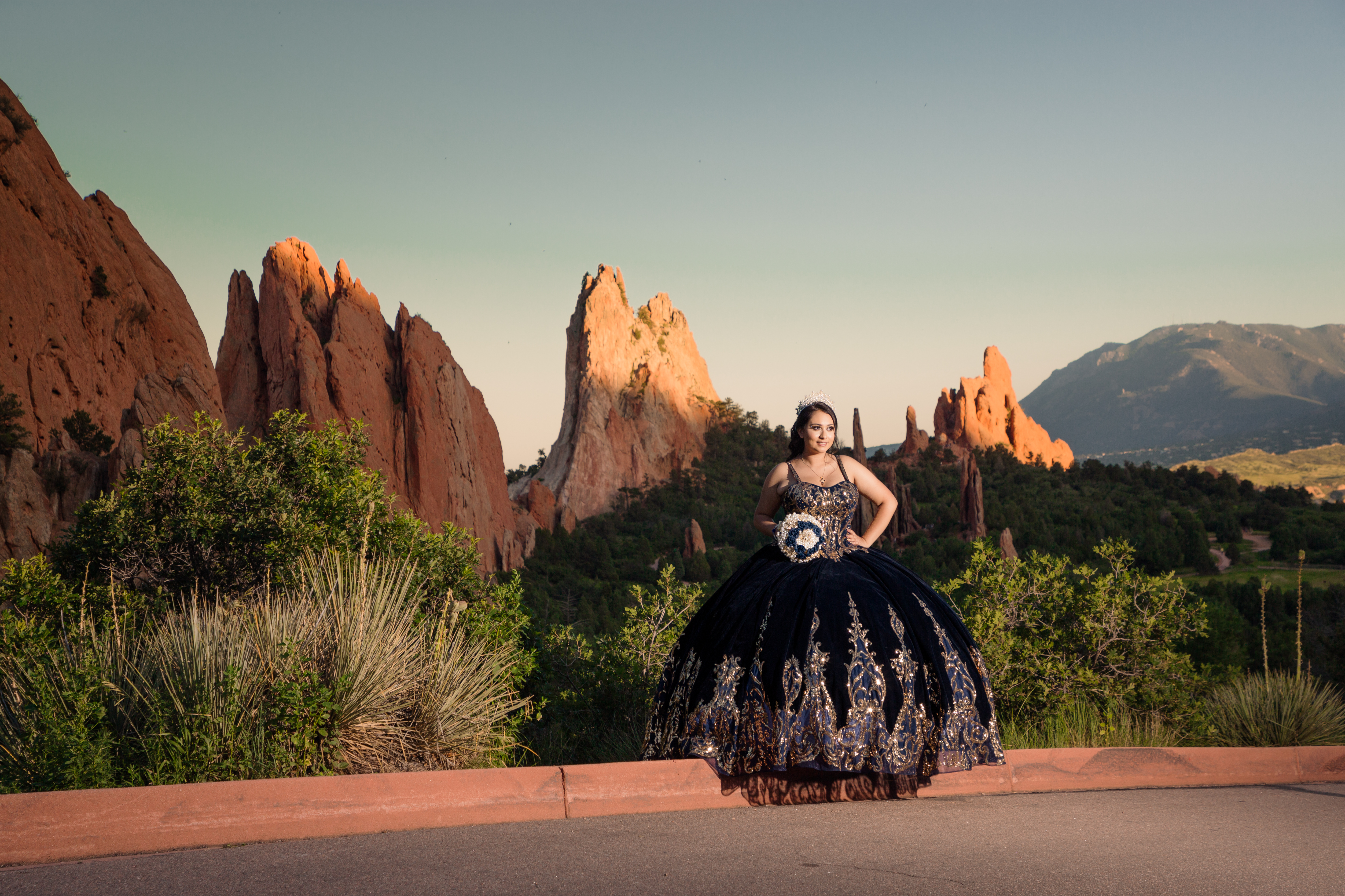 - Quinceañera in a navy blue dress posing at Garden of the Gods in Colorado Springs with red rock formations and mountains
