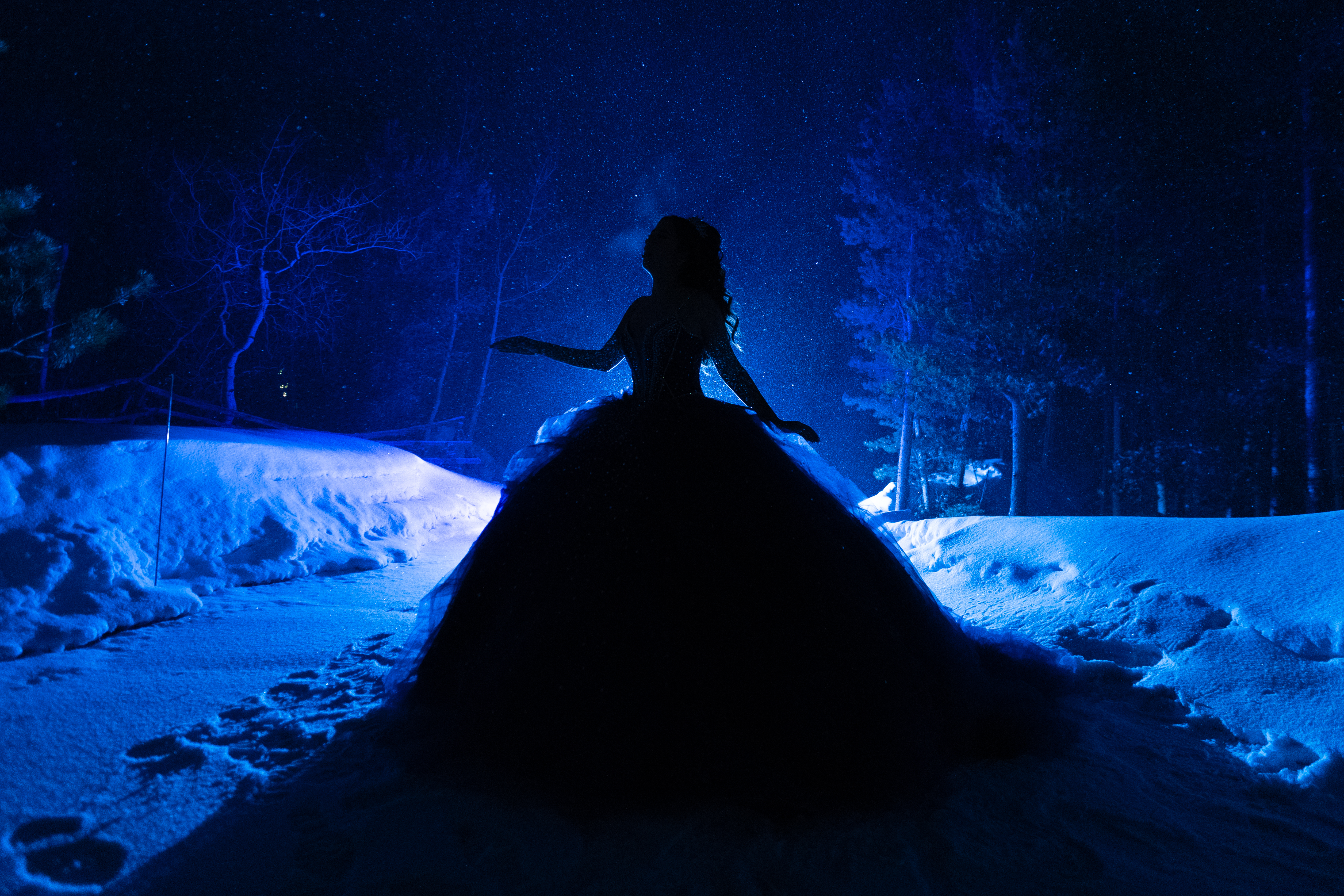 - Silhouette of a quinceañera wearing a ball gown posing in the snow at night during a winter quinceañera photoshoot in Colorado