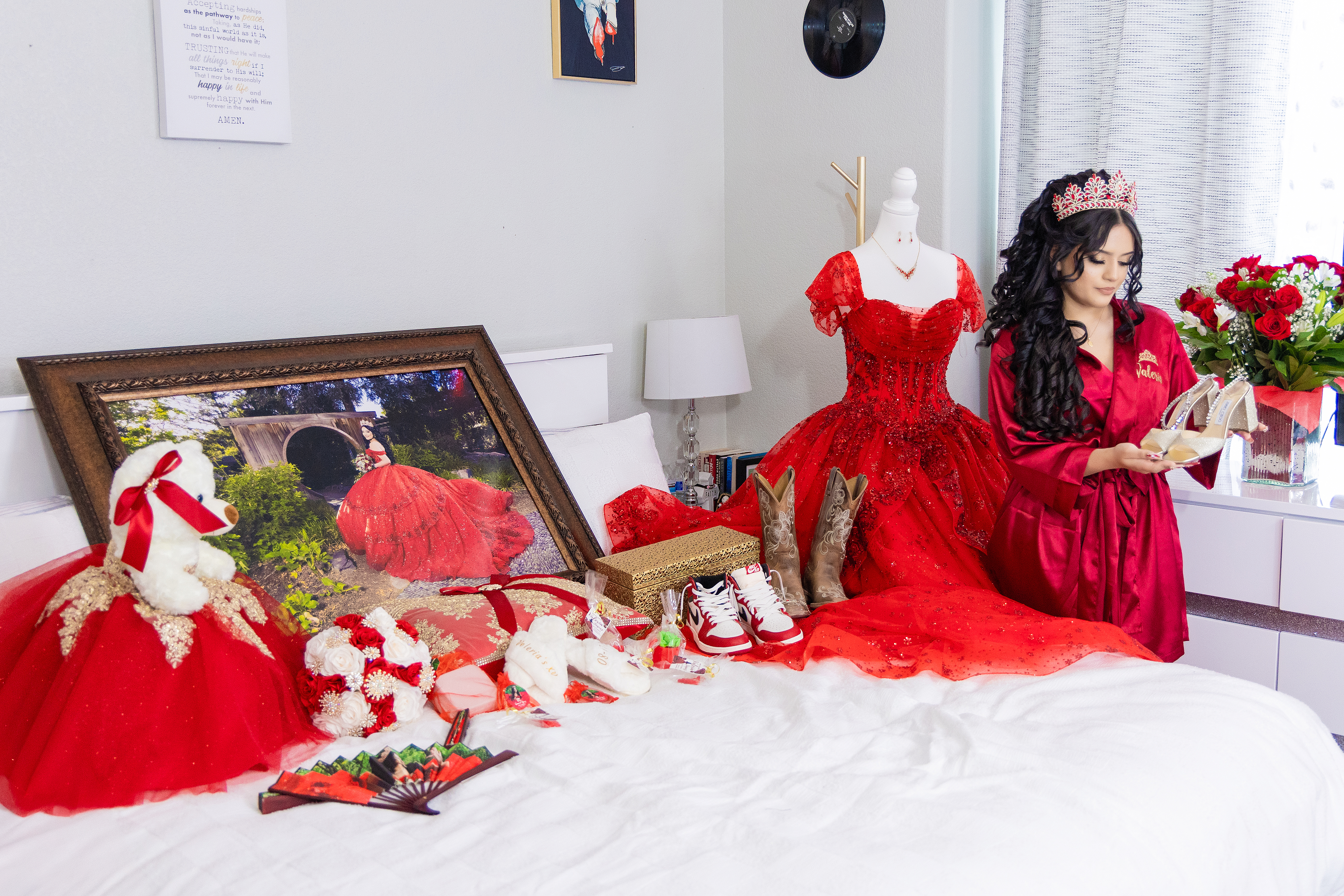 - Quinceañera getting ready at home in Denver featuring red dress, crown, accessories, and traditional details before the celebration.